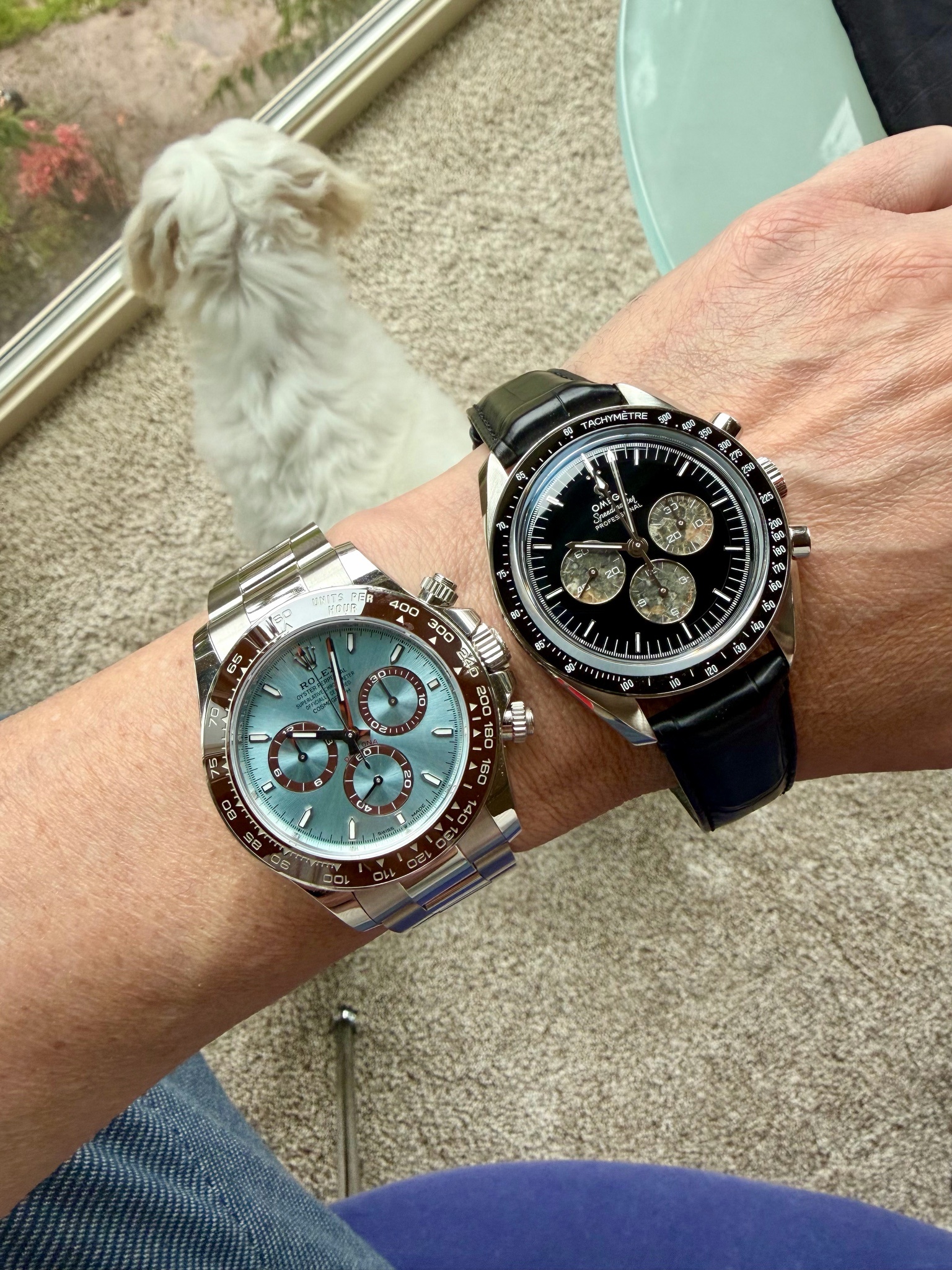 Very cute dog you have there - we just got a puppy one week ago as well. What breed is yours? As for the watches - I might just about be able to stomach the heft of the Omega, definitely not the platinum Daytona 🤷🏻♂️😊