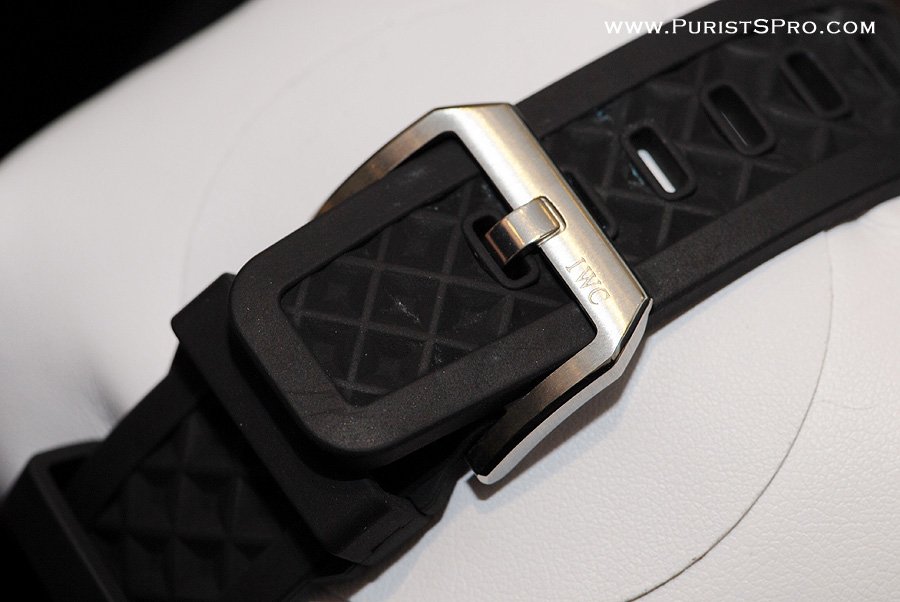 Notice the strap is textured and has indentations going inward into the strap. A lot of crud can get stuck inside these indentations, so IWC will be redesigning the rubber strap as a result of dirt accumulating in these crevices.