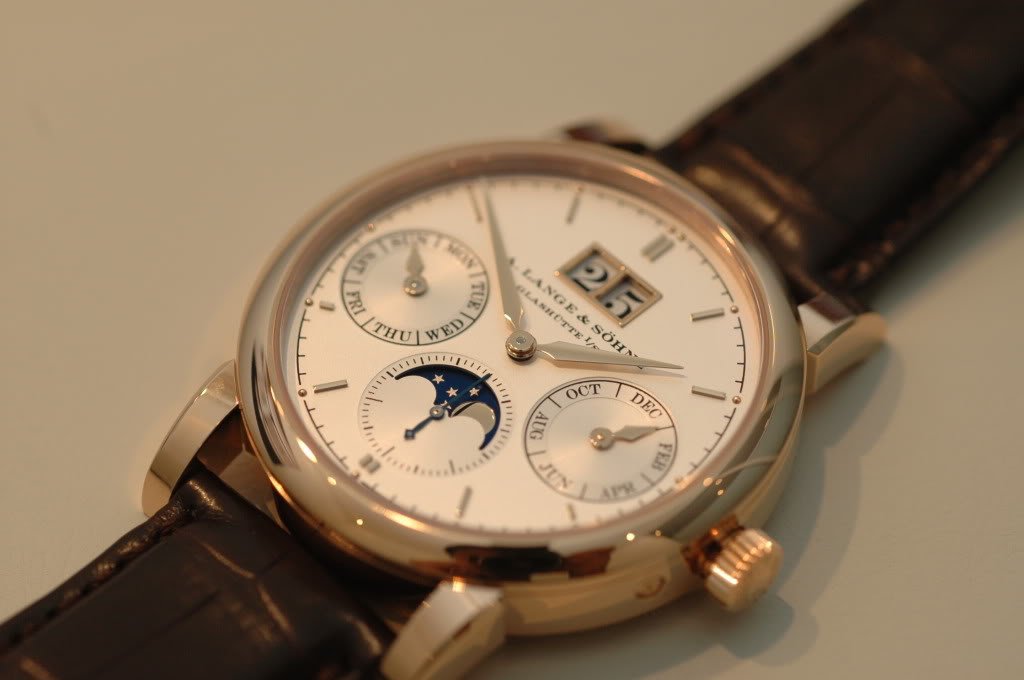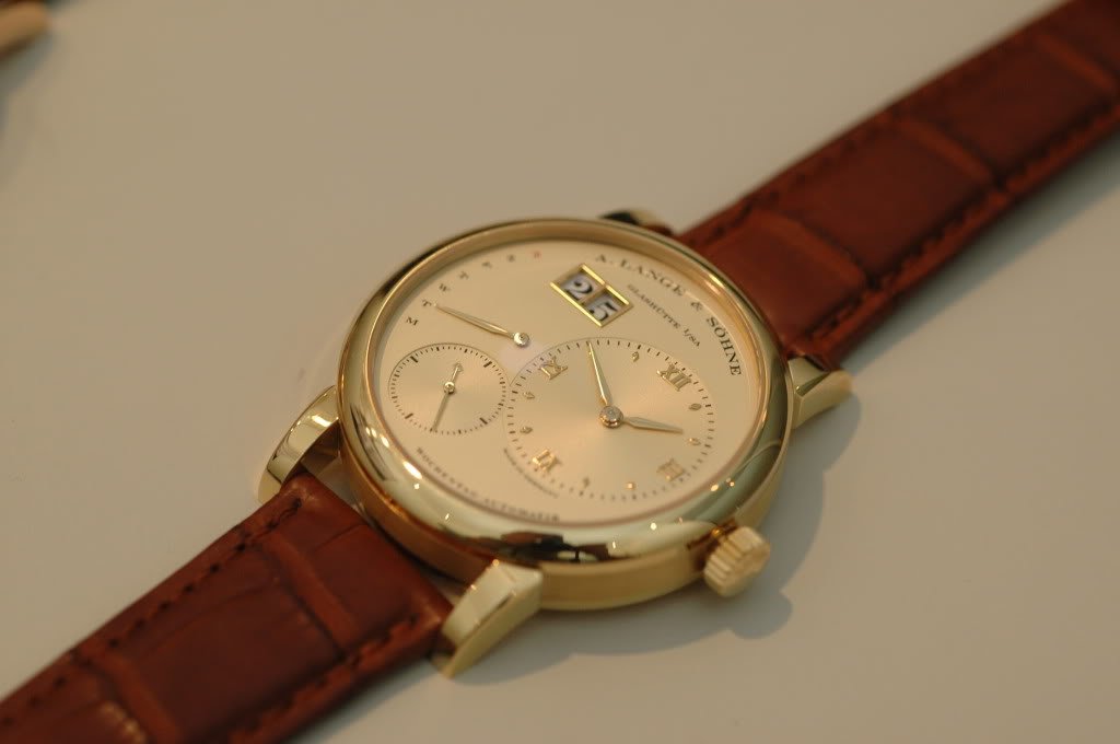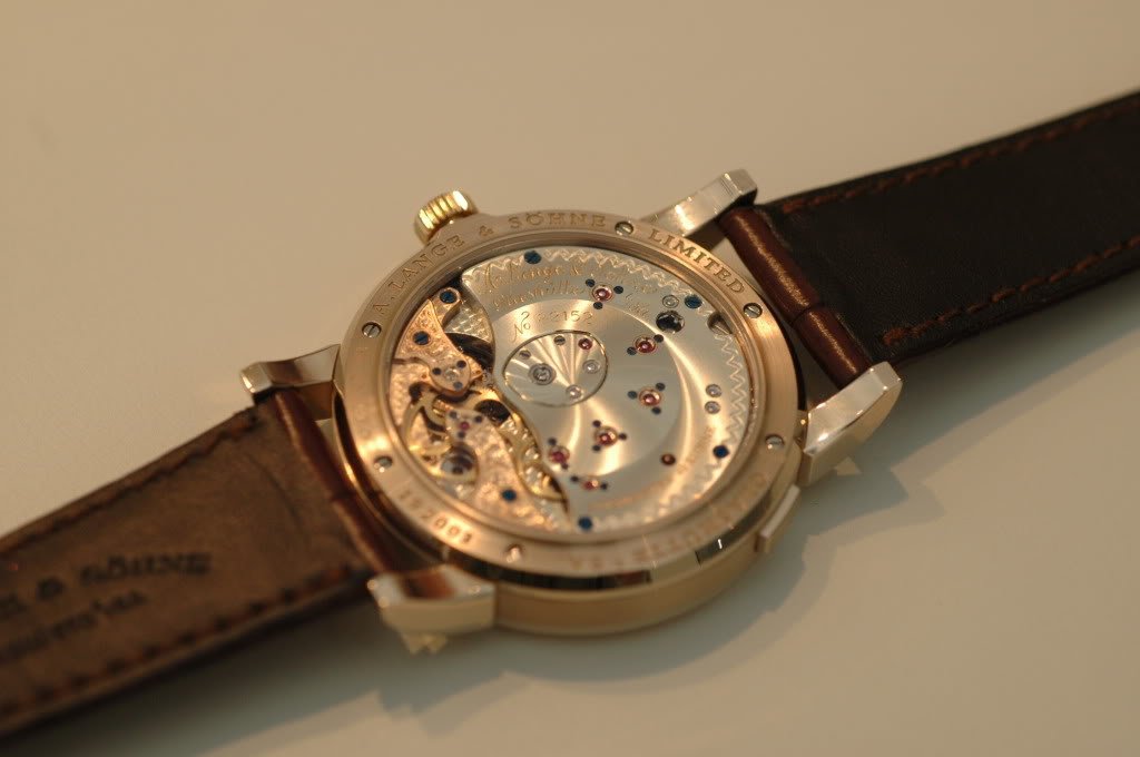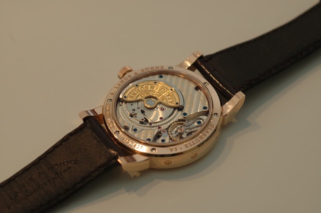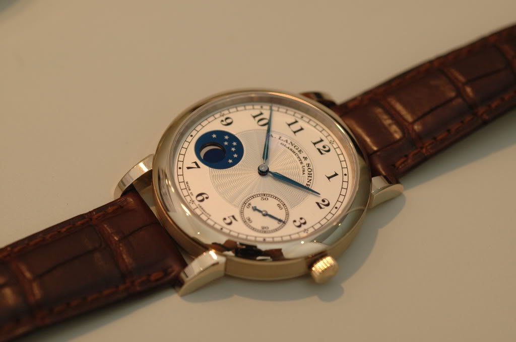 It's simple and there is nothing superfluous on the dial, with a very attractive moonphase, and a refreshingly different finishing on the movement that ties in closely with Lange's tradition as a pocket-watch maker. Not to mention a relatively attractive pricing. I will try to post some comparisions of the honey gold with other gold, shortly. Jon (Z3)