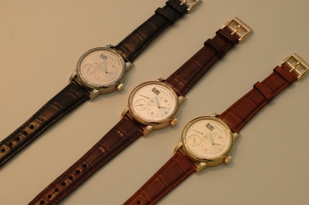 The Lange 1 Daymatic, in Pt, RG and YG (from left to right)