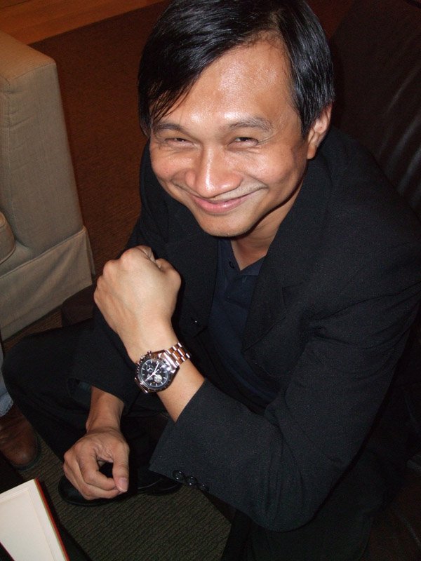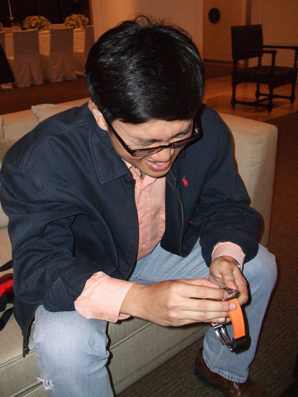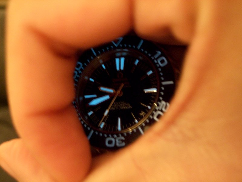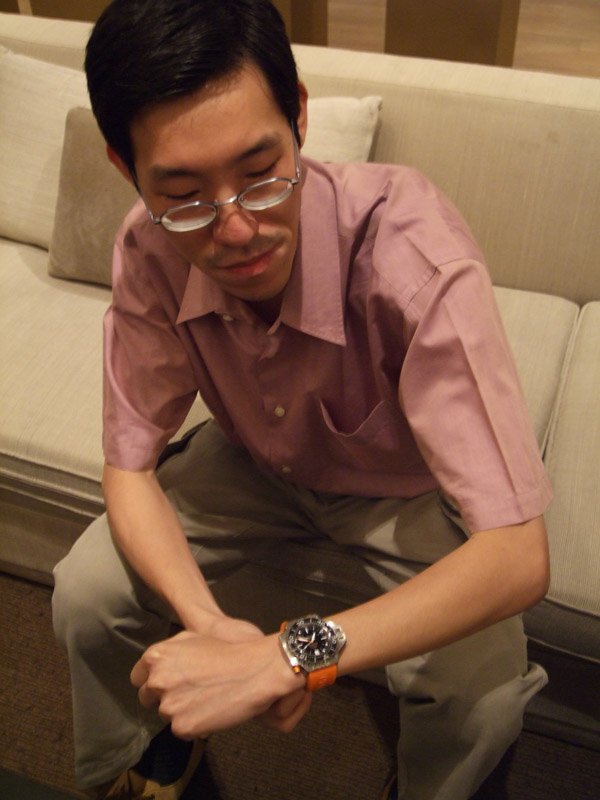 I had the opportunity to play with the watch shortly before the event but I did not care to check the lume. Then, after the dinner, I asked to try the watch again. This time it came right off the showcase with all the spotlights. The blue lume was fully charged and obvious when my hand partially covered the watch. I went speechless for one moment. Wow! Here's the Ploprof on my skinny 6.5" Asian wrist... In case you are wondering where the shirt sleeve has gone, these three pics were not taken on
