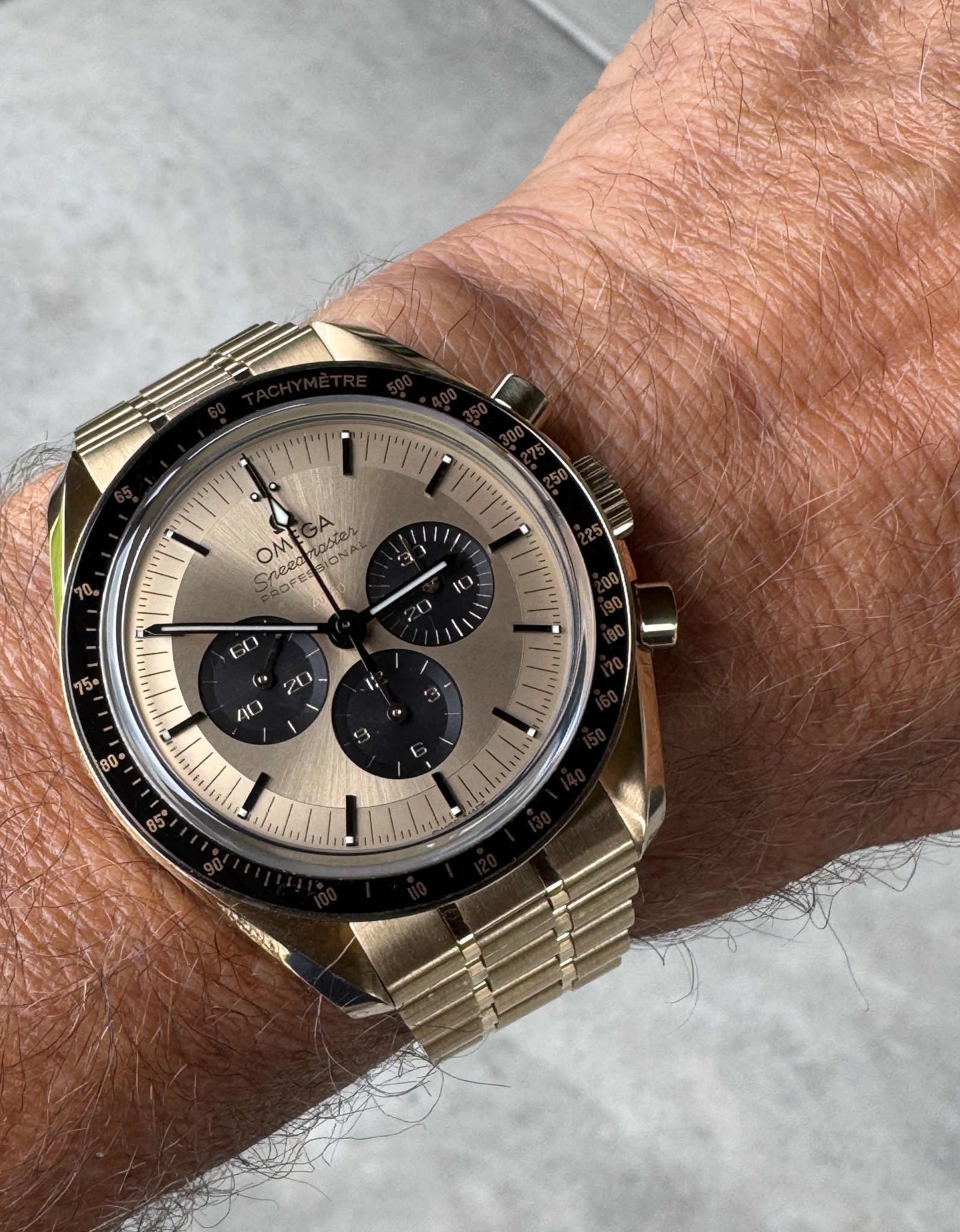 I really like the tone of Omega's Moonshine Gold and as you pointed out the black contrast of the bezel hands and hour markers as well as the black and gold subials just work so well with it, it really is a great looking Speedmaster. Wear and enjoy it in good health. Marc