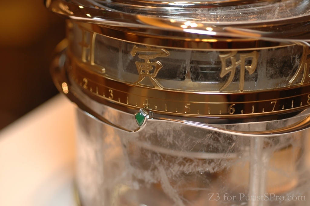 Time is measured horizontally on the base via a jade marker using scales in both the Western and the Chinese timing system - in which an interval is measured in 2 hours. The time shown below is 4am.