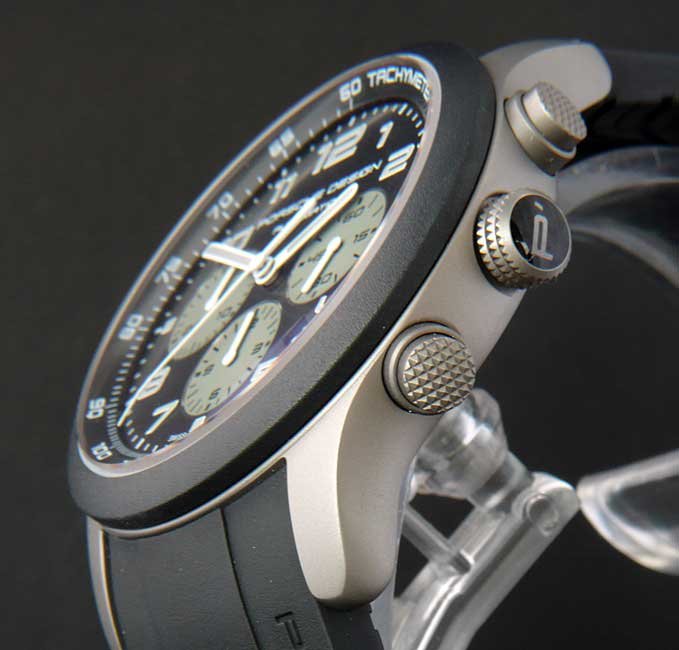 The Porsche Design P’6612 chronograph is manufactured by Eterna, this company having been acquired by Porsche Design in 1995. It has a full titanium case, that follows the classic Porsche Design outlines by avoiding any sharp edges. The case’s main body appears to flow into the lugs, and also the fully threaded display back is nicely blending into the curved outlines. The production of such a case needs is costly, but the effort is rewarded by a wearing comfort that is hardly met by any other wristwatch of comparable size on the market.