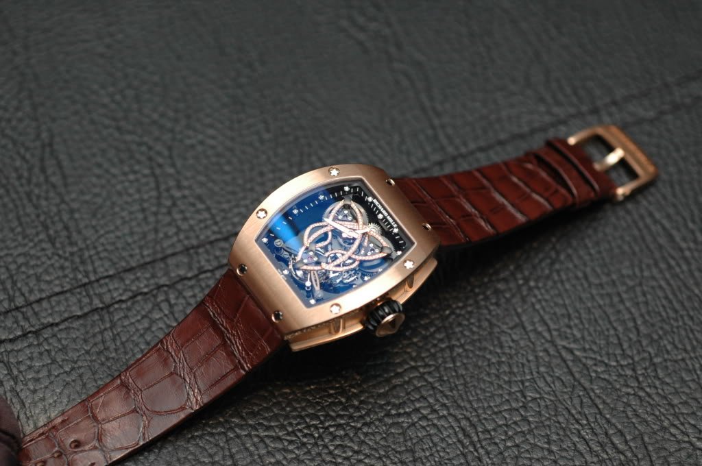 RM019 - This is my favorite watch at the show - the "Celtic Knot" (or the "Infinity Knot"). The three-dimensional diamond-set gold "thread" passes through various components of the movement, and ties into a knot. The bridge is made out of onyx.