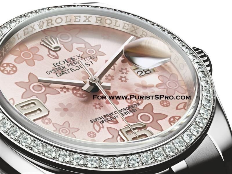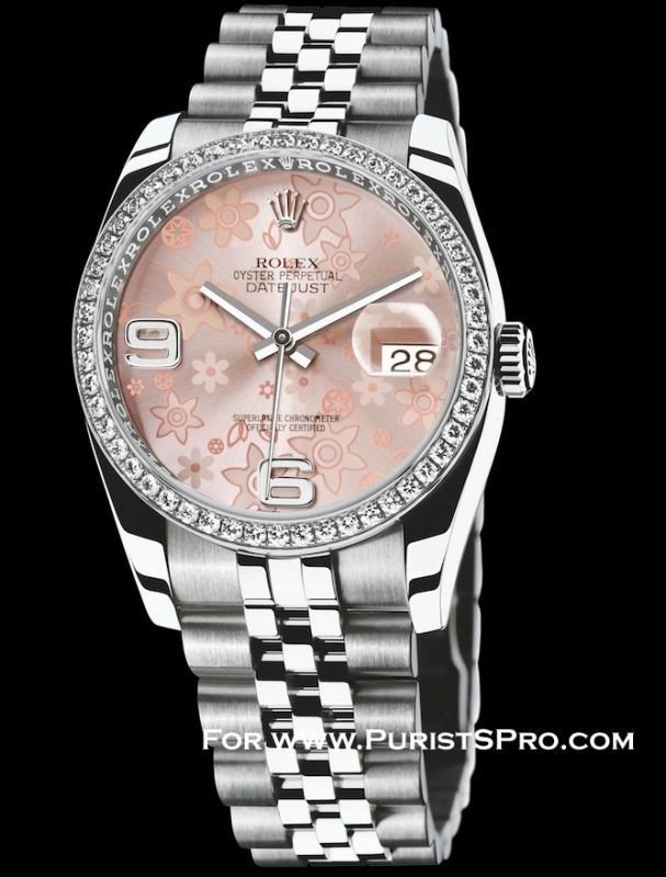 ...if any of my fellow Lady PuristS are actually drawn to either of the first two Rolexes pictured in this post (the Rolesor Ladies Oyster Perpetual Datejusts with the pink floral and green Rolex print dials). I wonder if I'm a freak amongst women, but I just cannot get behind the design elements on display in these two watches (and many other ladies' models, to be frank). In the case of the floral dial, is Rolex trying to capture an essence similar to the Louis Vuitton LV monogram? Does Role