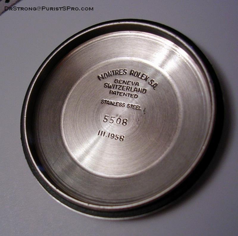 Finally here’s a ref. 5508 from 1958. This watch also has a replacement swiss - T< 25 dial, but this one is glossy with gilt markings, which is a very rare feature. The white sweep second hand is not very common either: