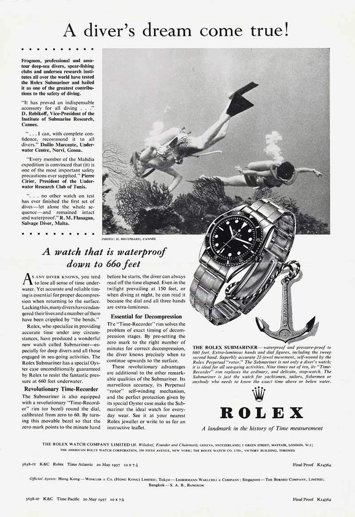 The production of the Rolex Submariner started in 1953 and the watch was first presented to the public at the Basel Fair in 1954 under reference 6204. This watch is generally considered as the first modern diver’s watch, together with the Blancpain Fifty Fathoms which was issued the same year.