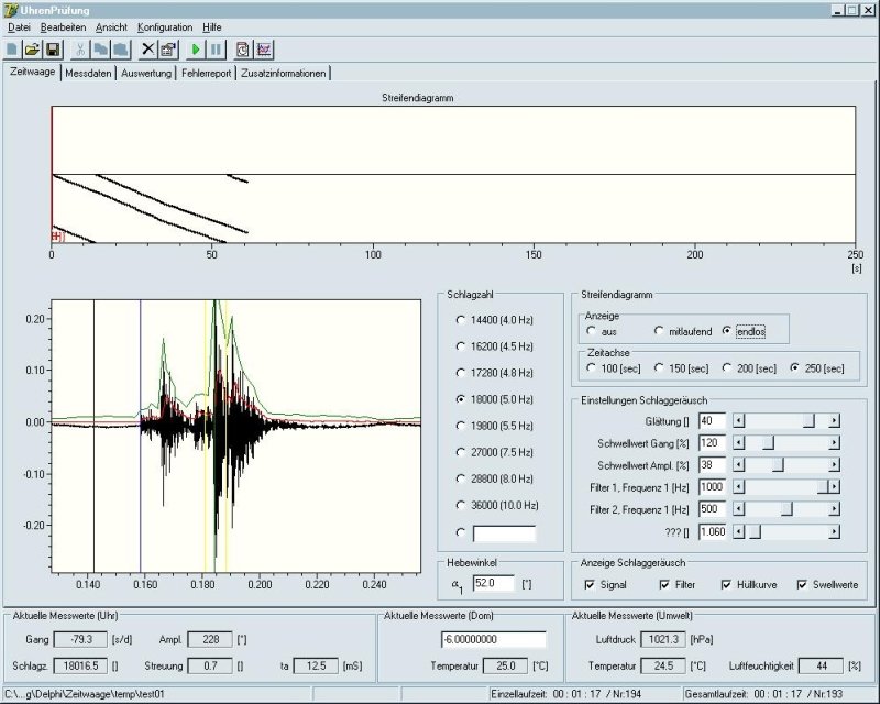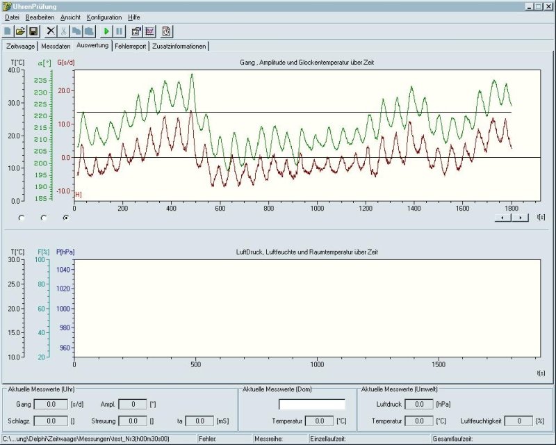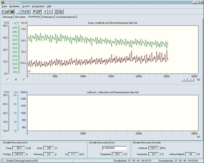 For example a screen shot of a test of an older watch. The two lines in the diagram show the rate and amplitude over the time. You can see the changing of the amplitude (a result of change in the power transmission) and as a result of this, also the changing of the rate (?Anisochronism? in German). The time interval here is 25000 seconds (7hours). It is not necessary for the test that the watch has a loss of more than 90 sec a day. It is only interesting to see if the rate will be constant -90 sec a day.