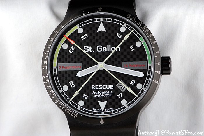 In today’s world of watches, black watches seem to be the latest “hot” trend - Audemars Piguet recently released its all forged carbon Team Alinghi, IWC debuted its ceramic cased Pilot’s double chronograph last year, and the square Bell & Ross PVD BR01 is becoming a common watch to see at watch enthusiast events. If you are hunting for a black watch and don’t have $5k, $15k, or $40k to spend, then you might want to take a look at the St. Gallen PVD Disinfectable “Rescue” watch. Not only is it affordable and easy on the wallet, the “Rescue” is a rugged, entertaining, and functional timepiece.