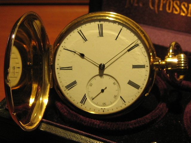 18k gold hunter case, enameled dial, Roman numerals, steel spade hands. Manufactured approximately 1875.