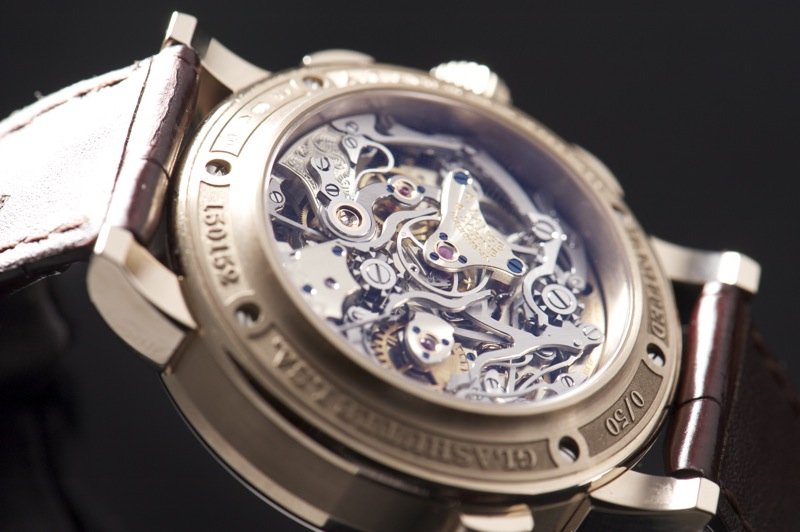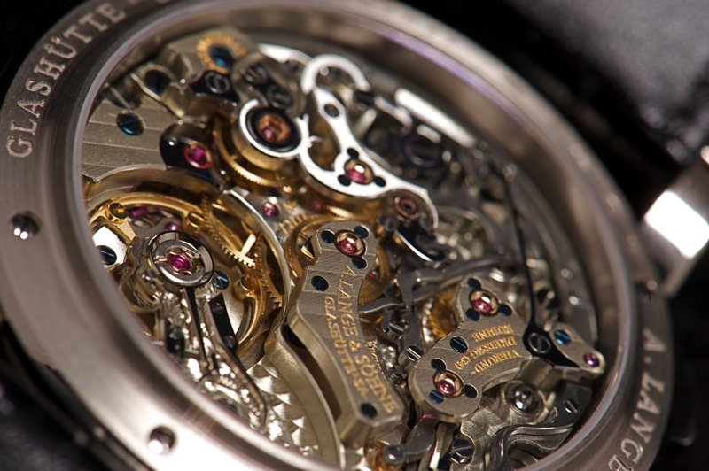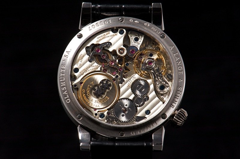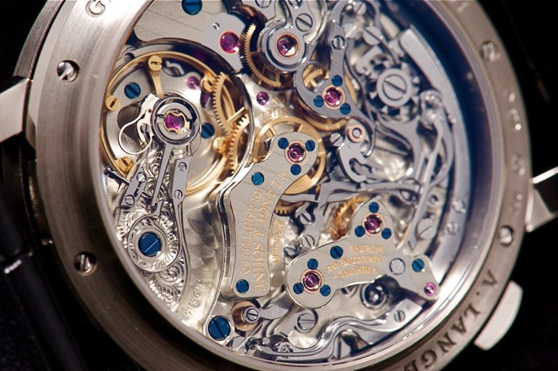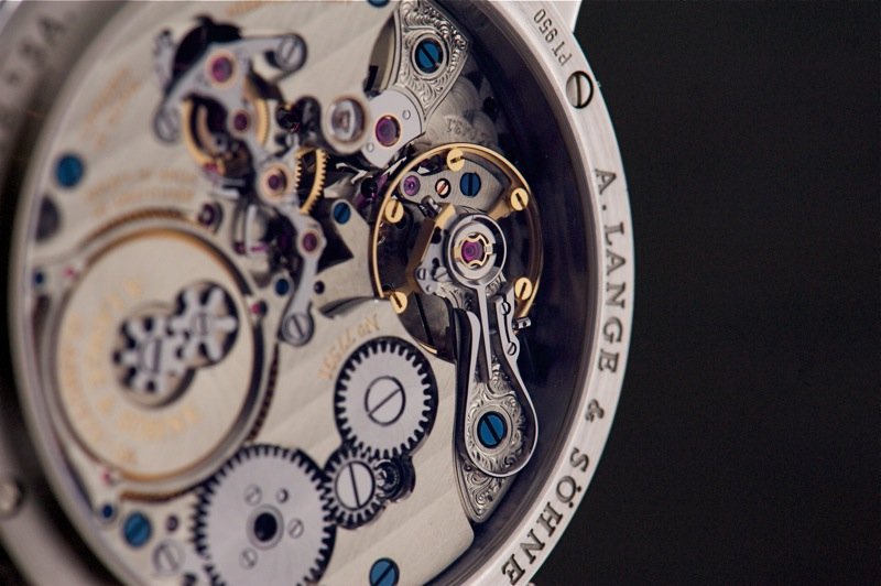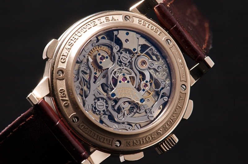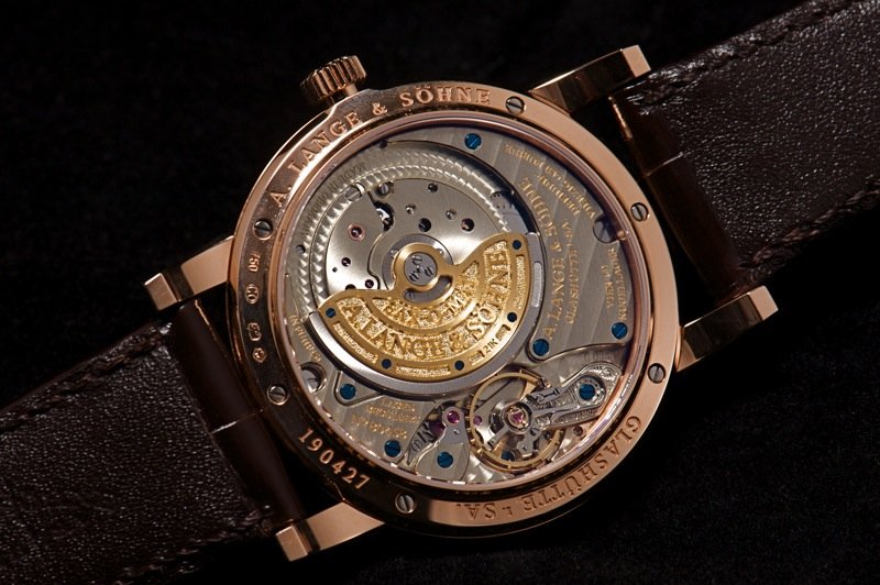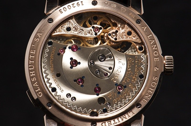 Again we see on the movement side, Lange's new policy of giving us more to look at. The boldly engraved full-size rotors are very eye-catching -