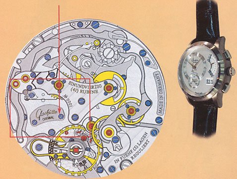 The second pic shows the new chrono movement cal. 61 (41 jewels, column wheel). Contrary to our speculations, this movement is not selfwinding, however, there is a large space left (framed red in the pic) which could later serve to house an autowinding mechanism. The new 'PanoGraph' looks at first sight like its big cousin, the PanoRetroGraph. Yet the most exclusive features of this haven been omitted: No flyback, no countdown, no striking mechanisms.