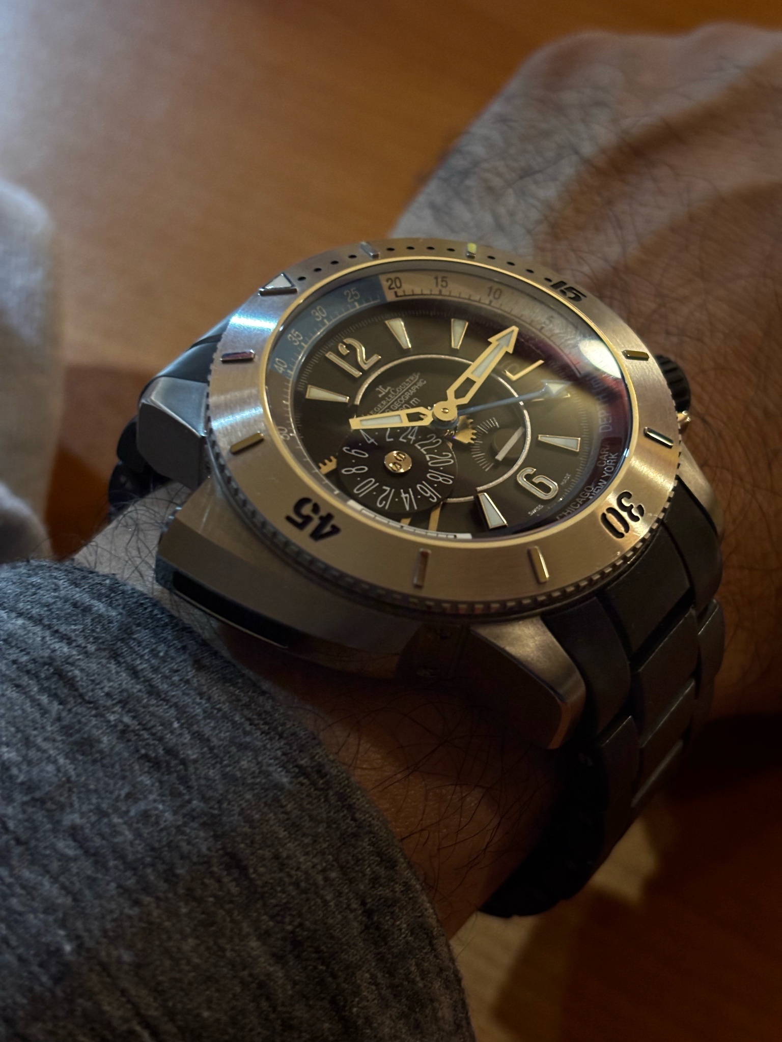 I like every fine detail: the polished indexes, date frame and bevels, the multi dimensional levels of the dial, the fine brushing of the case’s surfaces, the lightness of the watch for it’s bold size.