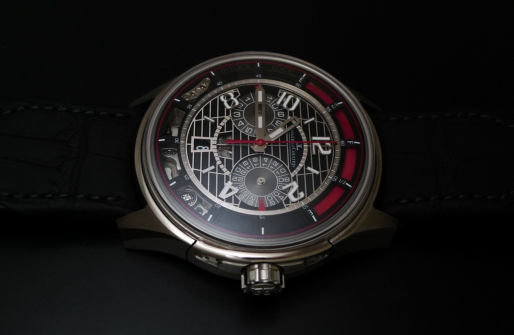 The Amvox 7 is borrowing the 44 mm case of the Amvox II " sister ", made of Titanium Grade 5, with its smart system ( pivoting case / vertical trigger Chronograph ), but is somewhere between the Amvox II and the " Grand Chronograph " in terms of thickness ( 15, 64 mm ).