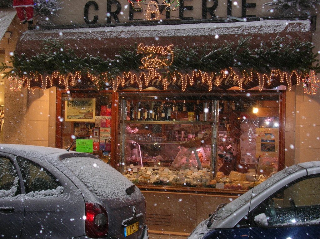 the Ile Saint-Louis, snowing. this fromagerie was right across the street!