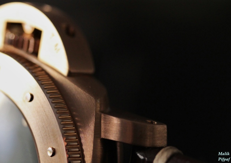 The Nautilus-looking bezel (from « Pimp my Submersible feat Nemo », not « Da Pa-teK by MC Genta ») is the centerpiece of this watch, it gets a patina fairly quickly and the polished “Paris nails” indexes show up like gold choppers. Thanks to bronze, the bezel looks less flat that the 305’s, one almost returns to the pitbulian feel of the Bombas, with extra comfort. Regarding the bottle-opener, because of the low contrast between the bronze and the color of the skin, it is far less noticeable than on the other 47mm Luminors.