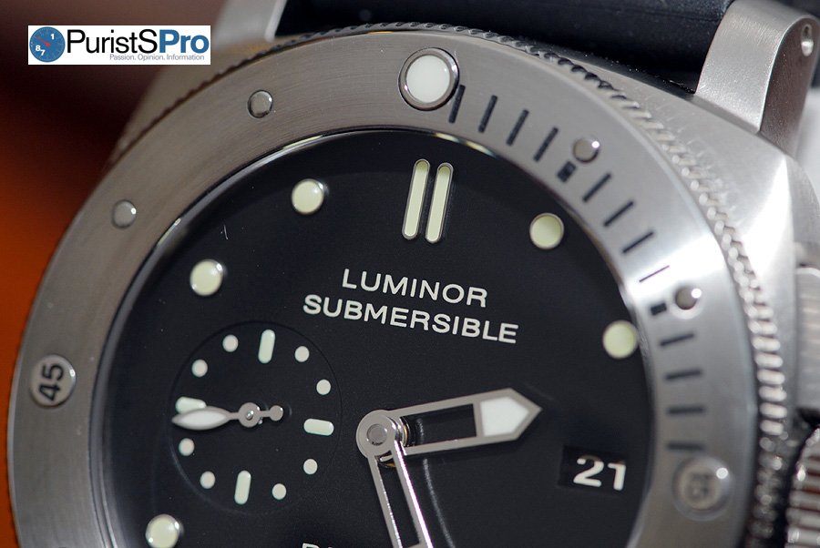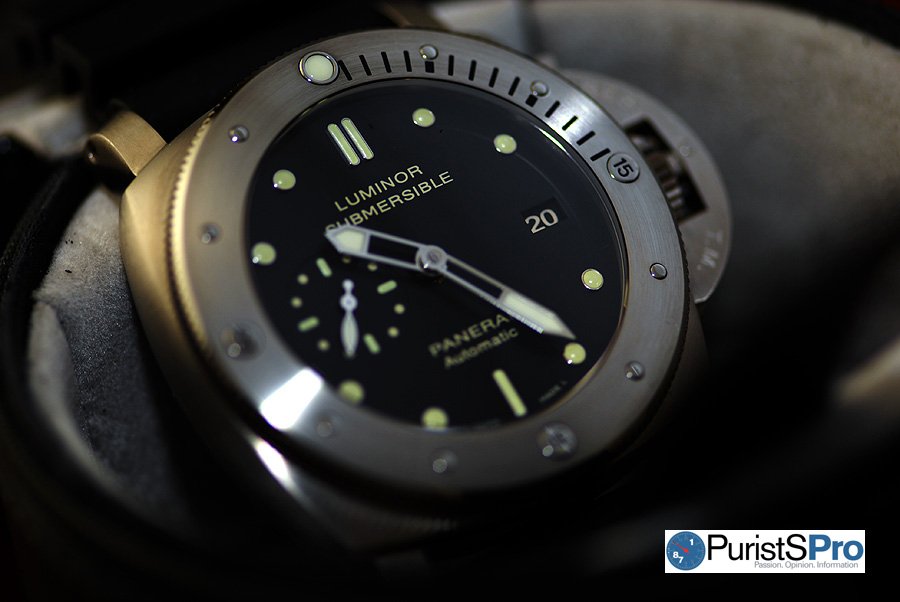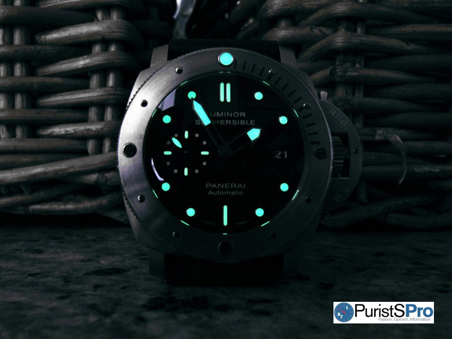 Up until several years ago, Panerai would use tritium on the hour markers and hands on all its diving watches, such as the PAM202 Slytech Luminor Submersible Chrono 1000m. Tritium is radioactive so it glows all day long and isn't dependent on light for its luminescence. It also has a half-life of 12.3 years which means after 12.3 years, on average there will be half its original amount remaining. And then after another 12.3 years, there will only be 1/4 of it left. So this is why tritium slowly loses its luminosity over many years.