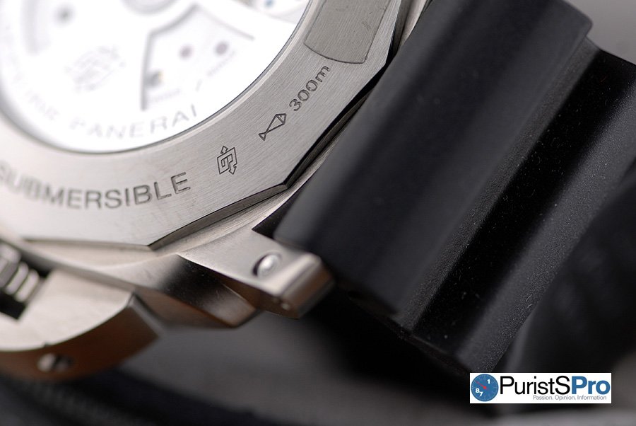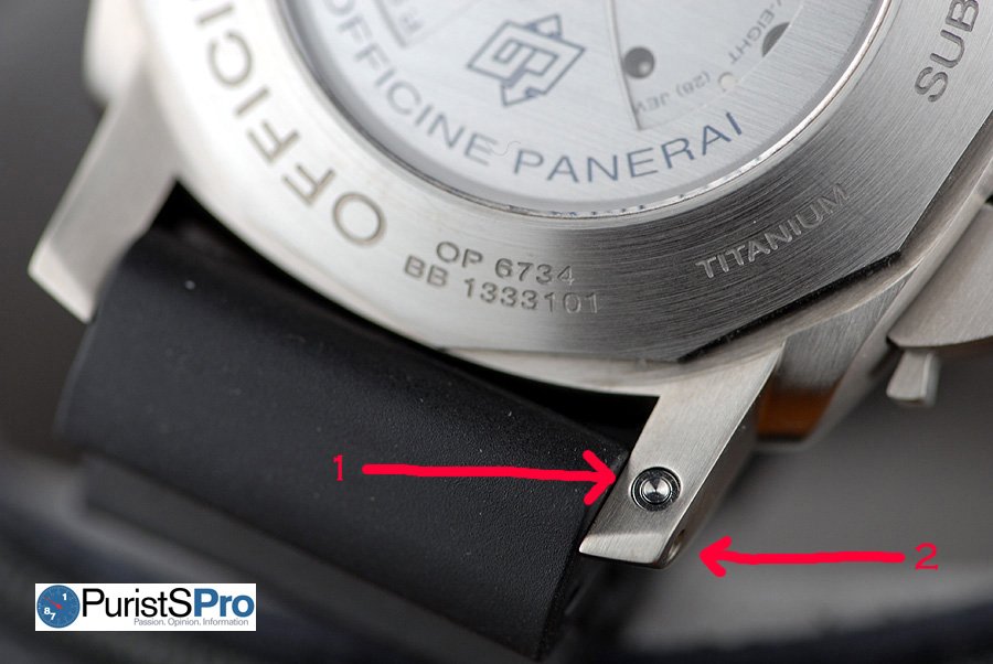 Panerai fans are notorious for their strap addictions, so if you want to dress your PAM305 with a different strap, swapping straps is an easy task. A second strap (black nylon strap w/ white stitching), screwdriver, and quick-set strap change tool are included with the PAM305. You can use the quick-set strap change tool, a ball point pen, or a toothpick to depress the quick strap change button located on the underside of the lug (see below picture).