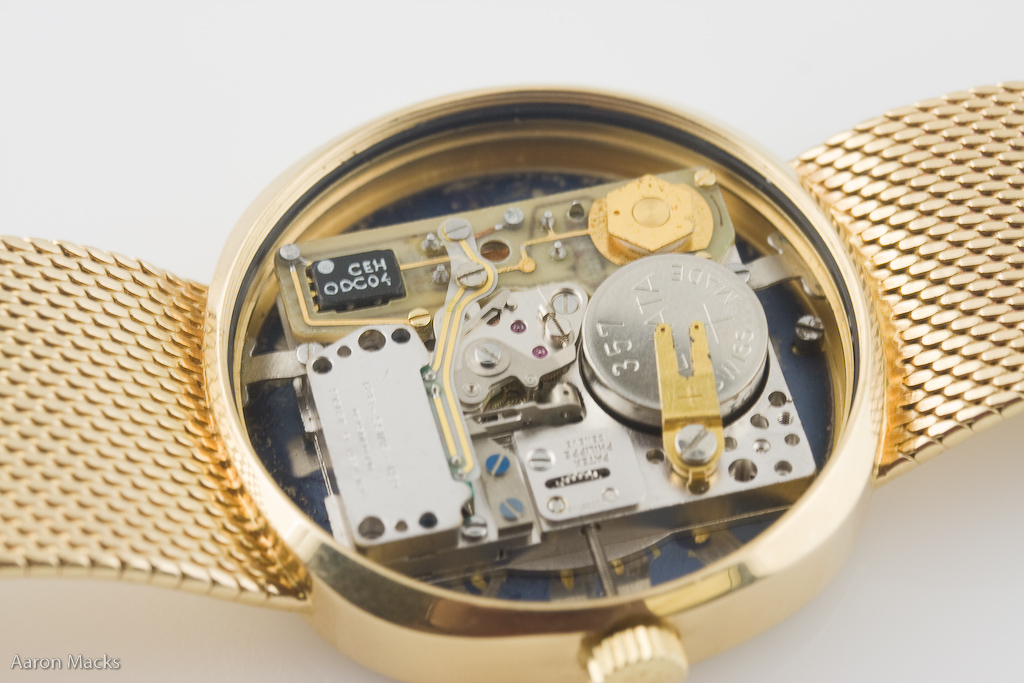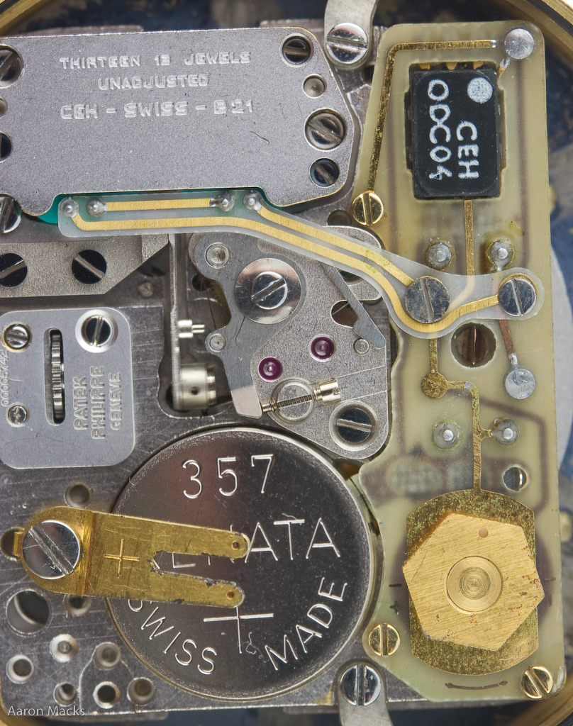 That blurry thing in the middle is not my poor technique this time, that's a vibrating lever of some sort, used to convert the quartz oscillations into the oddly-smooth sweep of the second hand