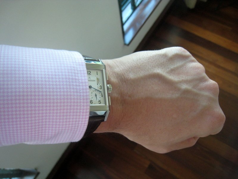 - my wrist is only 16.5cm, and I thought the watch would wear a bit large, but in fact it fits just perfect. And under a shirt cuff too, as evidenced by the picture above. I had tried the Reverso Duoface, a beautiful watch, but a tad too small for my taste. As for the 986 has fantastic proportions, but it was way too big for my wrist. It's an incredible luxury to have the choice of 3 different sizes for a somewhat similar model
