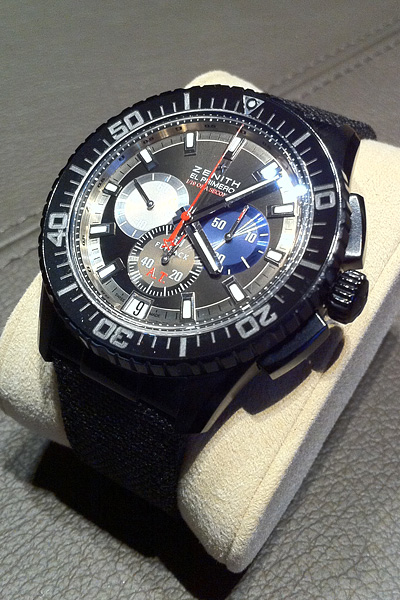 In addition to the basic model there will be a couple of special editions dedicated to some of Zenith’s ambassadors. My favourite was the Stratos Striking 1/10th Flyback A.T. It is made of black Alchron and sports a dark grey dial. The subdials share the colour code of the classic Striking 1/10th and look amazing against the dark background.