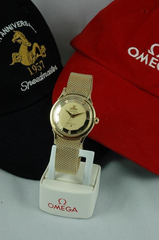 1956 Omega Constellation De Luxe OT 2799 auto, 18kYG/18kYG mesh, mirrored gold/sterling box (354)
