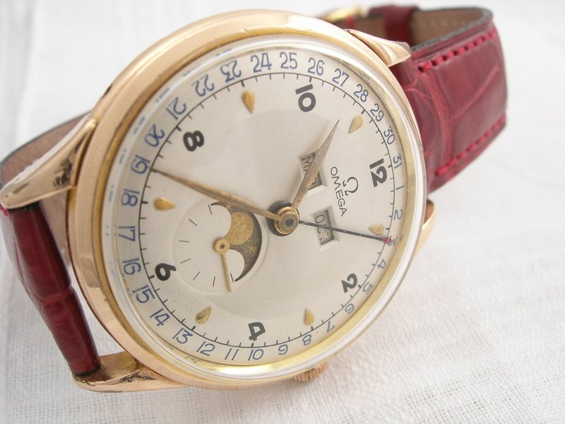 1947 Omega Cosmic Moonphase CO 2486 manual, 14kRGP/leather, silvered redial/1st year (27 DL PC)[not pictured above]