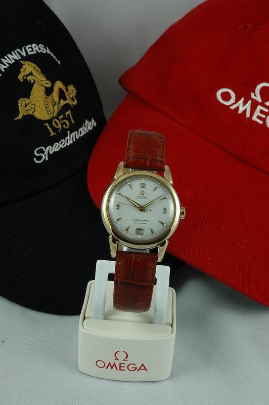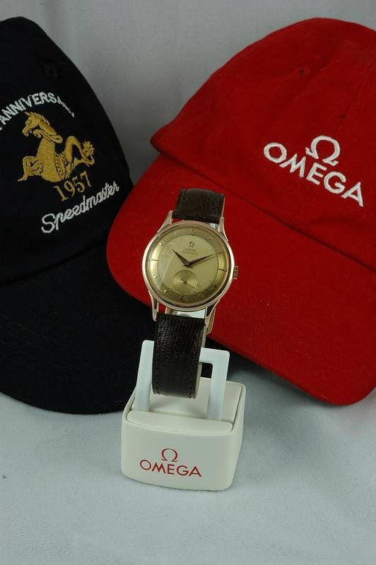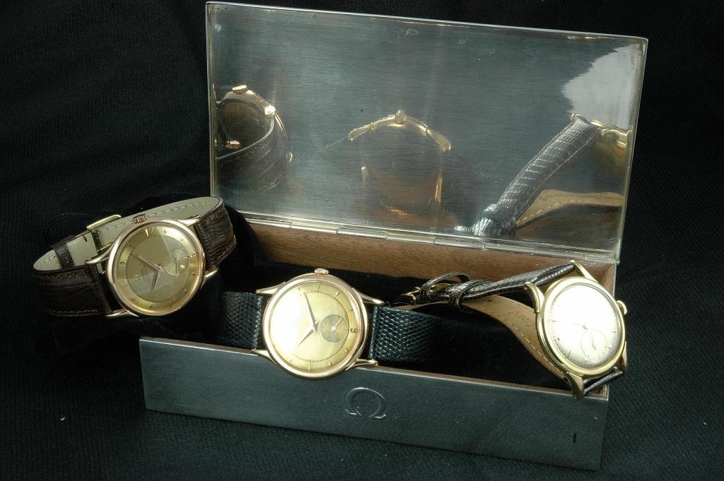3 examples of Omega's finest early automatics, the chronometer bumper autos, pictured on the style box the Centenaries were delivered in