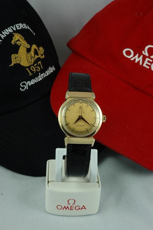 1959 Omega Seamaster 9068 auto, 14k YG/leather, white applied indices/chronometer (505)