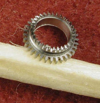 Complicated toothed rim, with two different gears; one is normal (Z30 m0.15), the other is beveled (20? Z32 m0.12). Also lying on a match and made for the new wristwatch.
