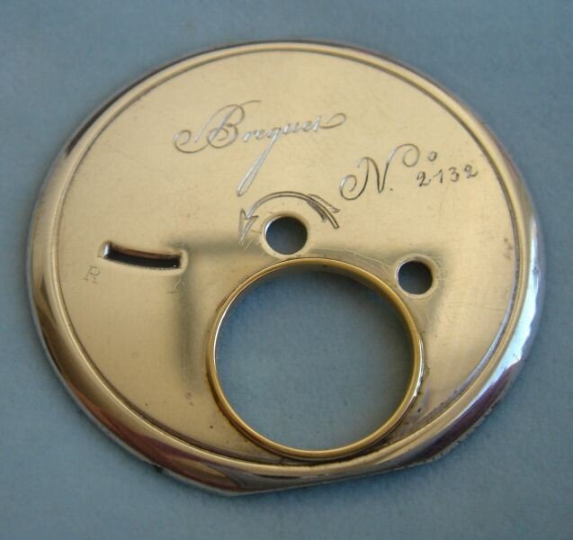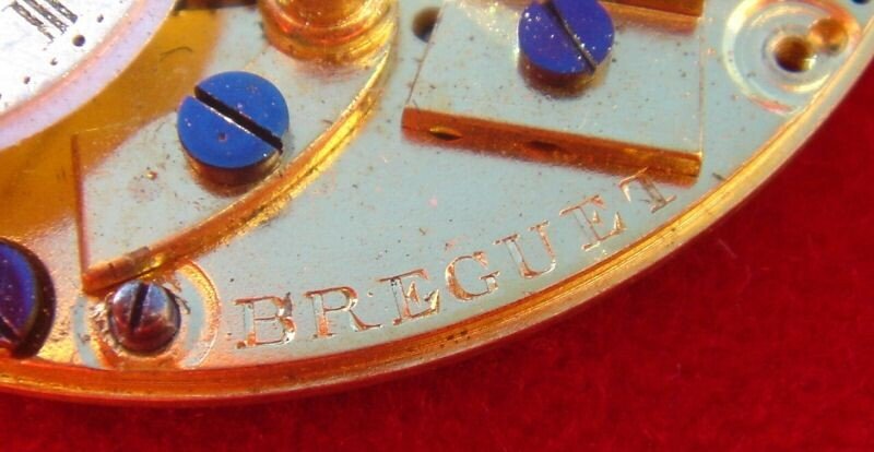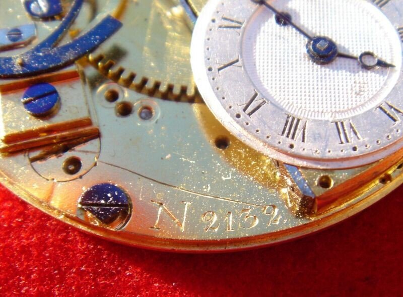 The movement, though very dirty, is actually in good original shape, is amazingly complete, and runs. It appears that one of the settings screws was moved at a later point in its life (maybe at the time of the recasing, to space them out more evenly on the dial side of the movement), partly obscuring the original, under-the-dial number, which I suspect was then re-engraved on the other side of the movement toghether with the word "BREGUET". It is also possible that all three of the dial-side setting screws were added at a later time, which should be confirmed during the movement's restoration. In any event, the watch perectly matches the description in the Breguet archives, with the correct number, and is thus certainly authentic.