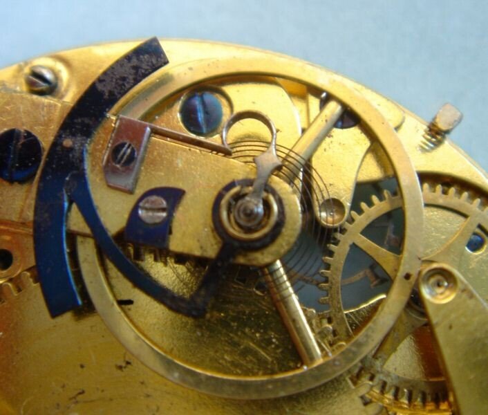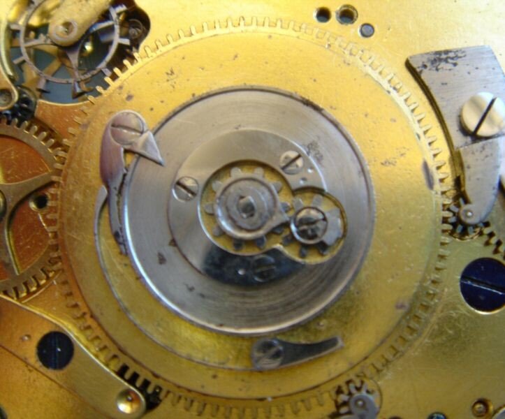 ). Note that the center post of the watch hands (which is normally used to set the time) is so small in this instance that a separate post had to be provided at 2 o'clock for this purpose.