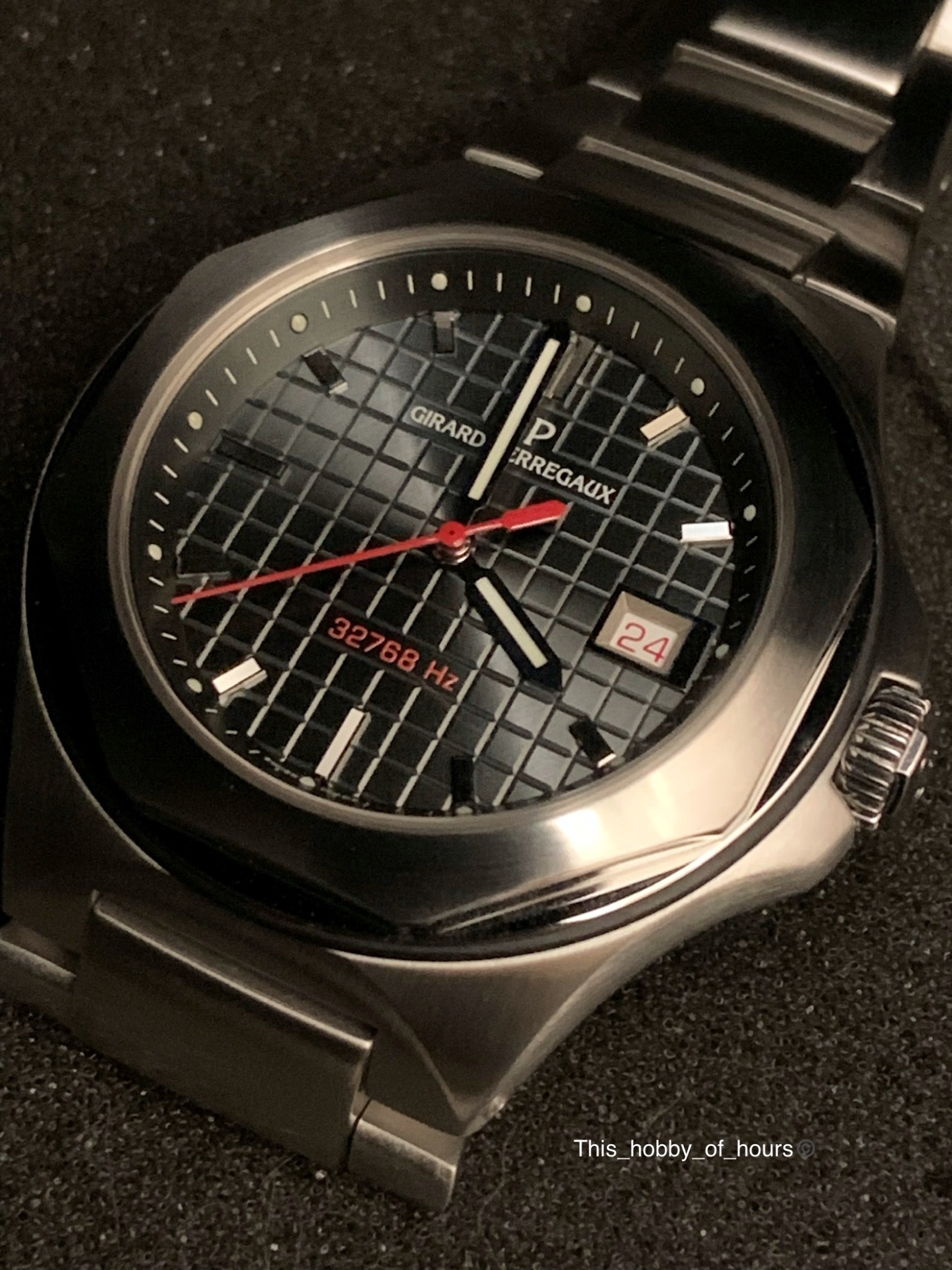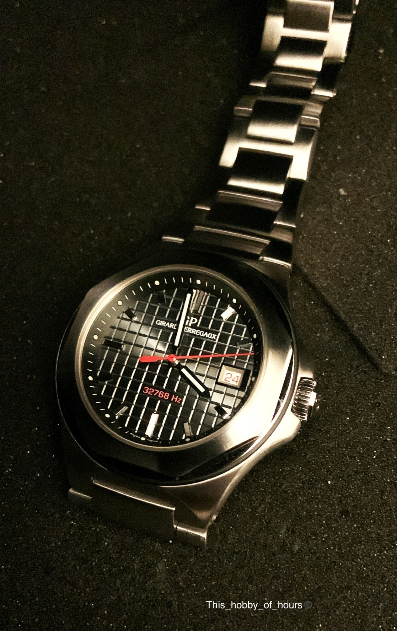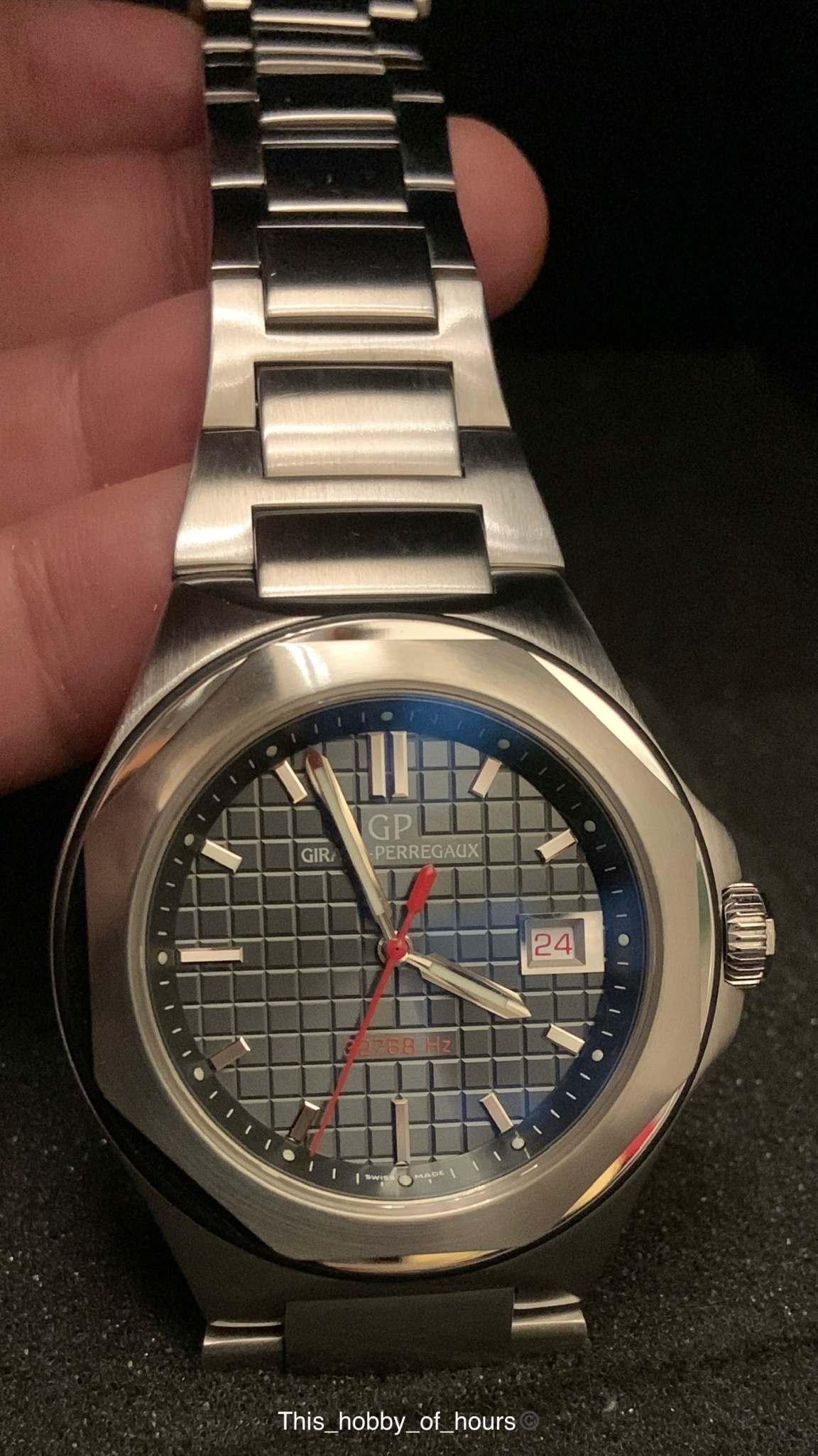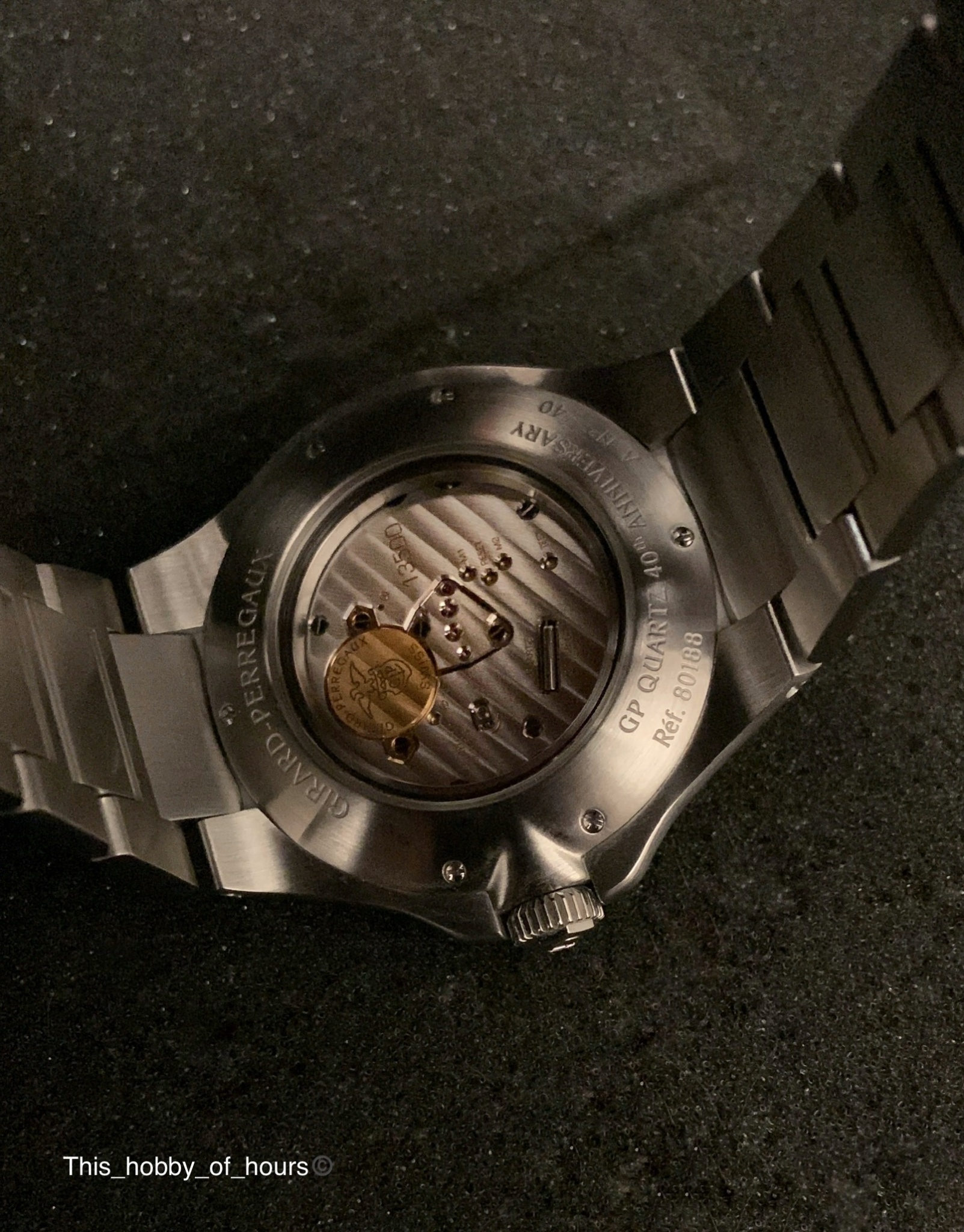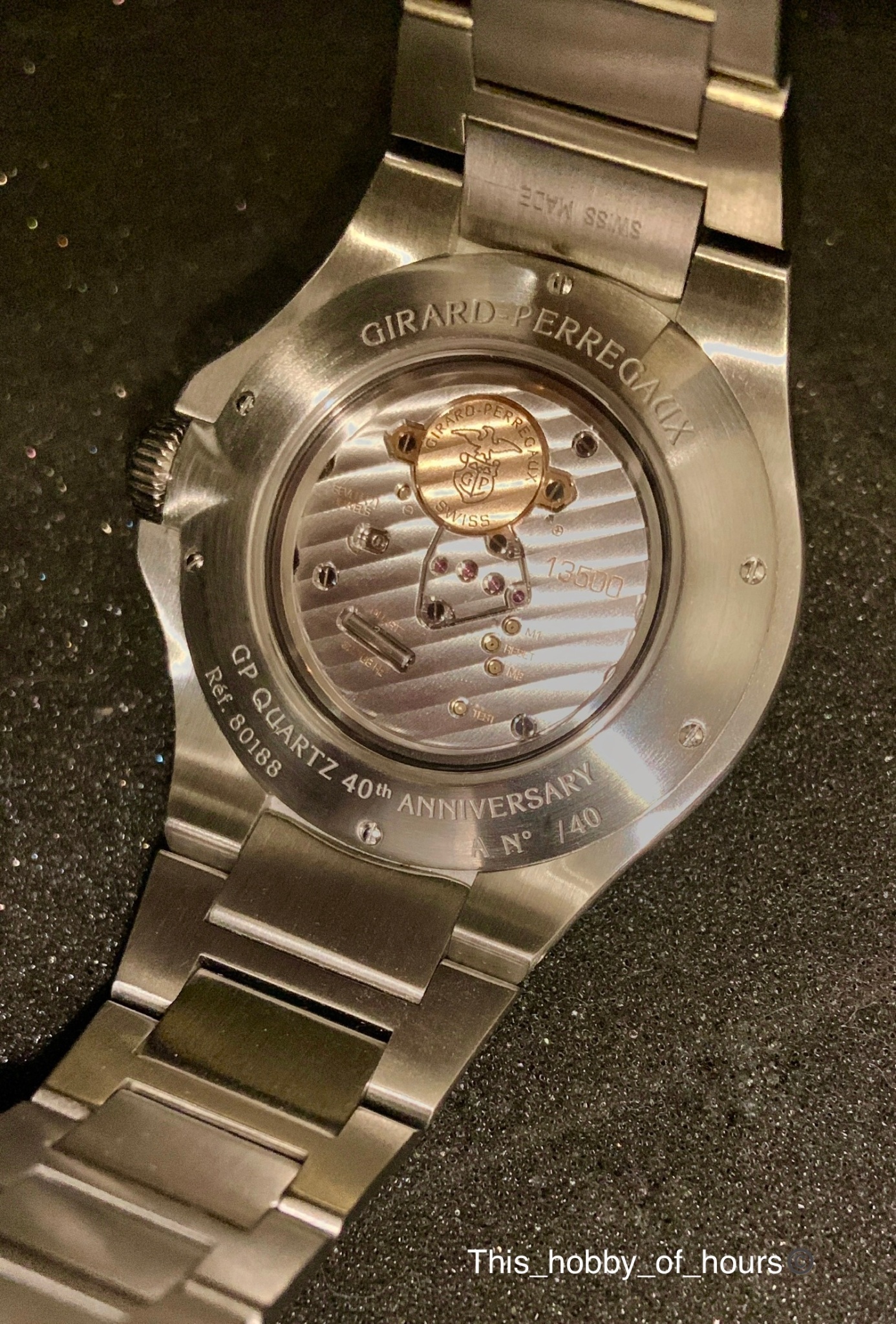 40 pieces were supposed to be made to match GP’s 40 th anniversary in quartz technology. Display caseback with decorated calibre 13500 unique.
