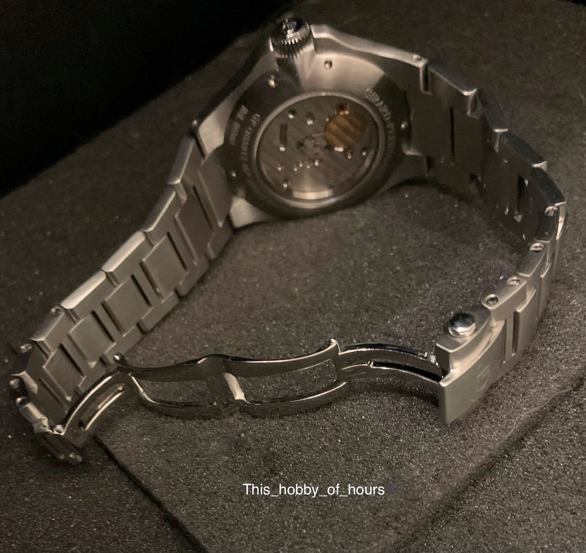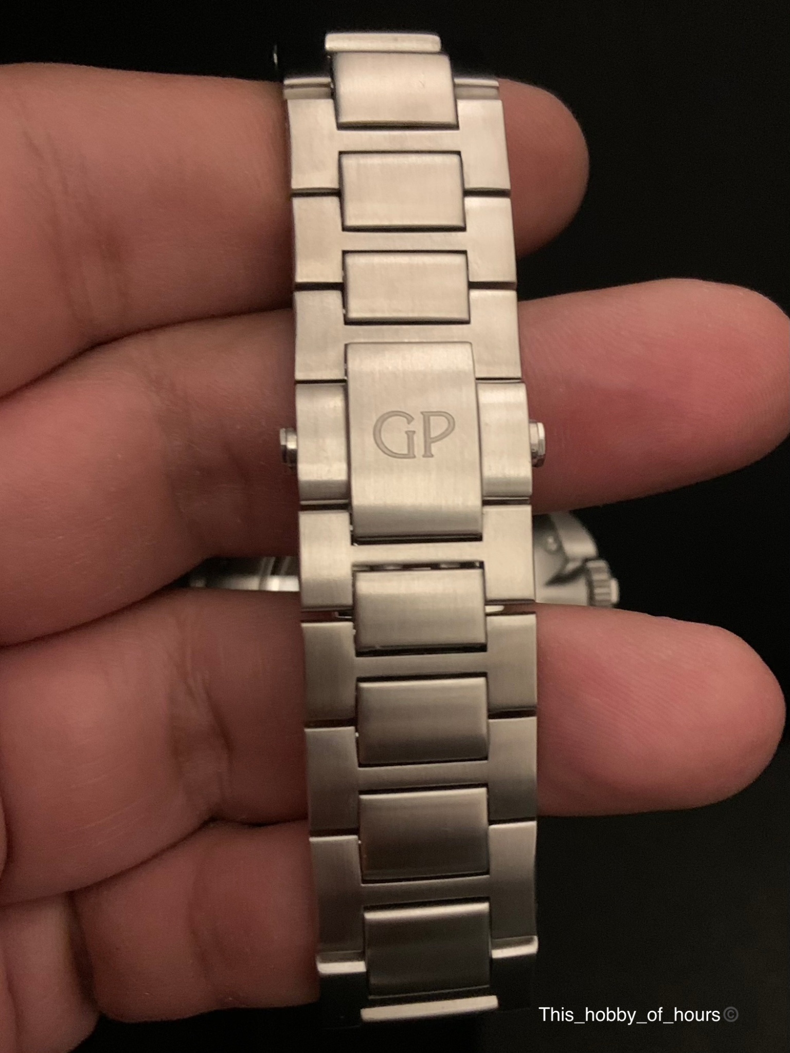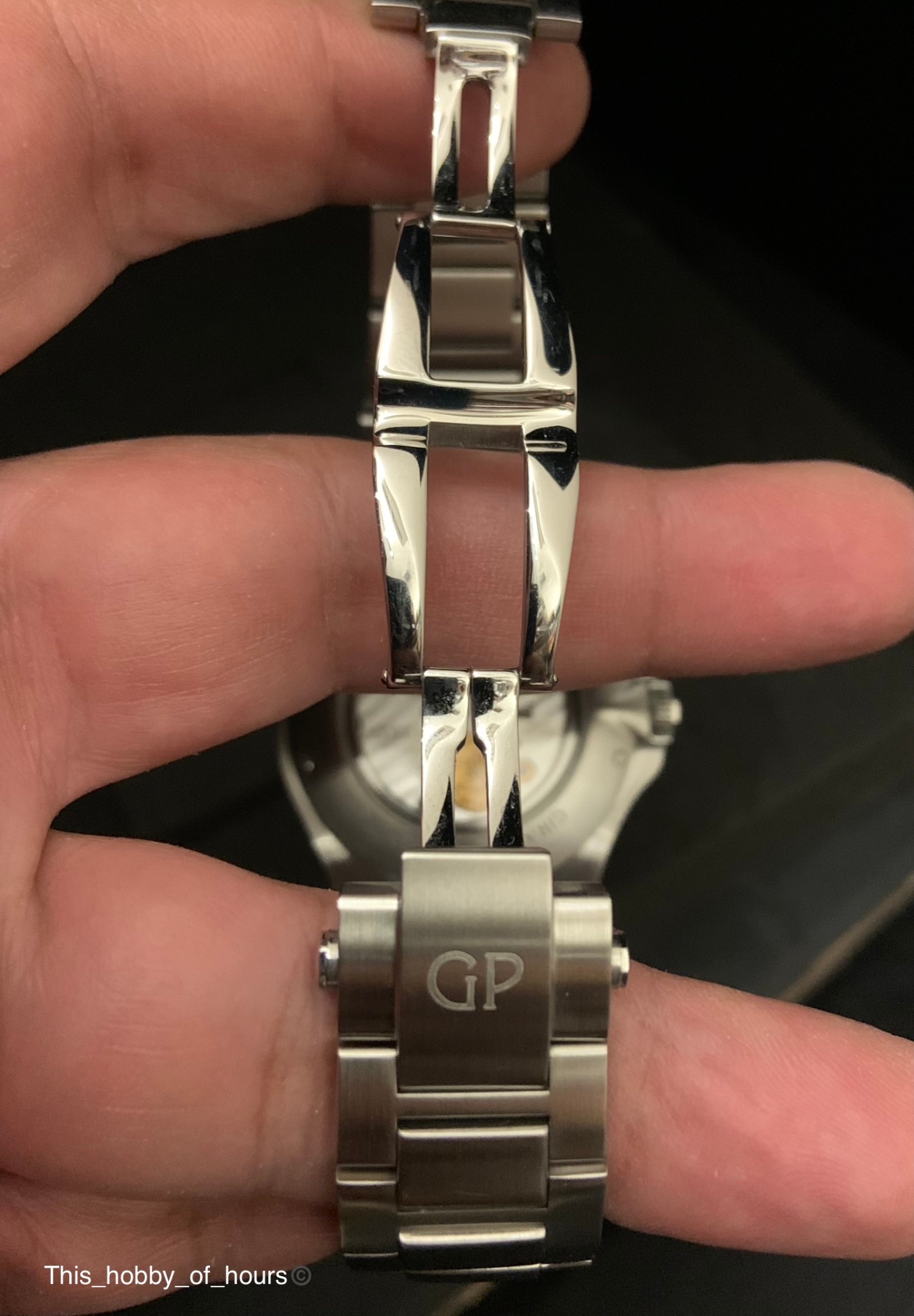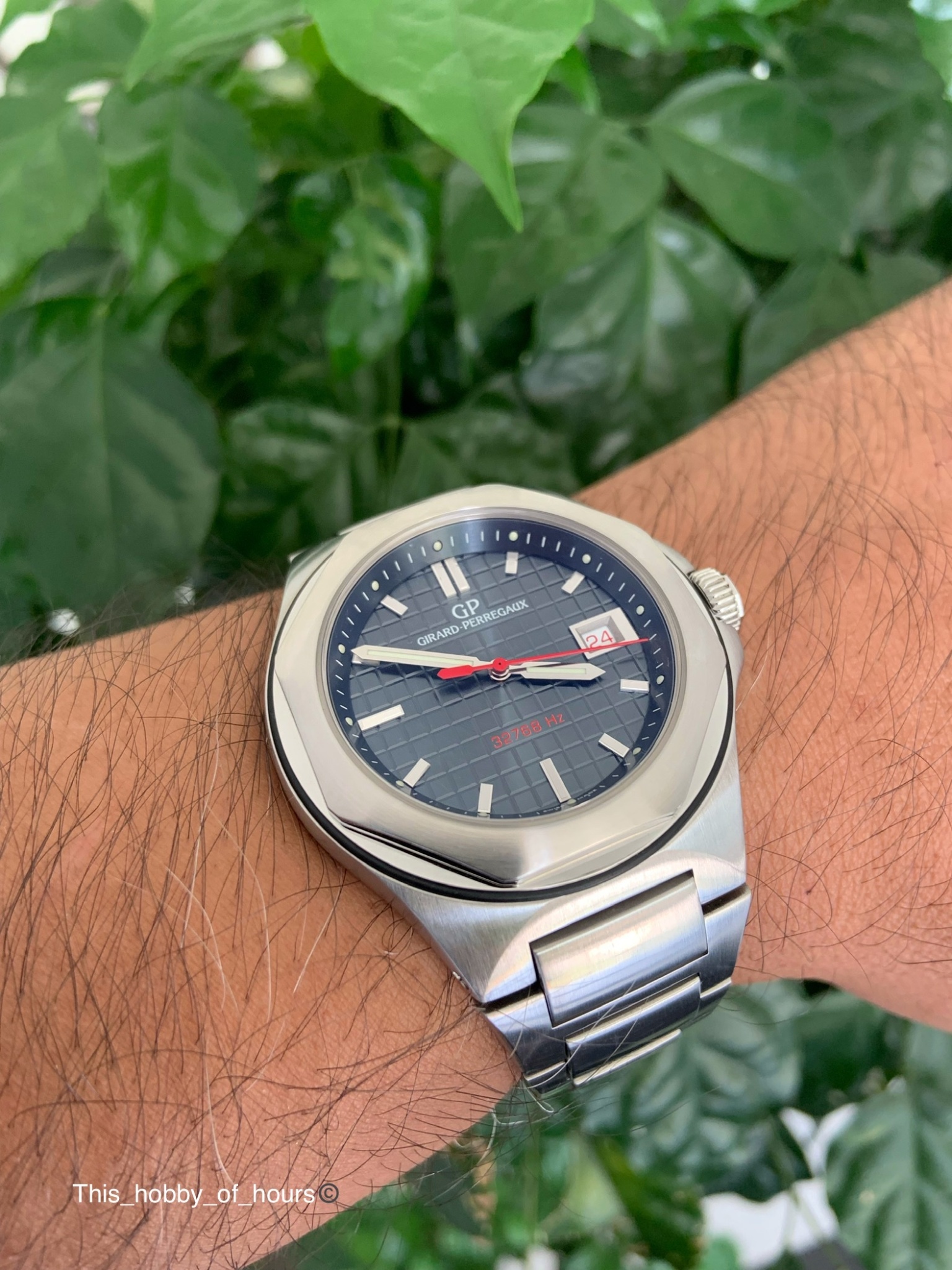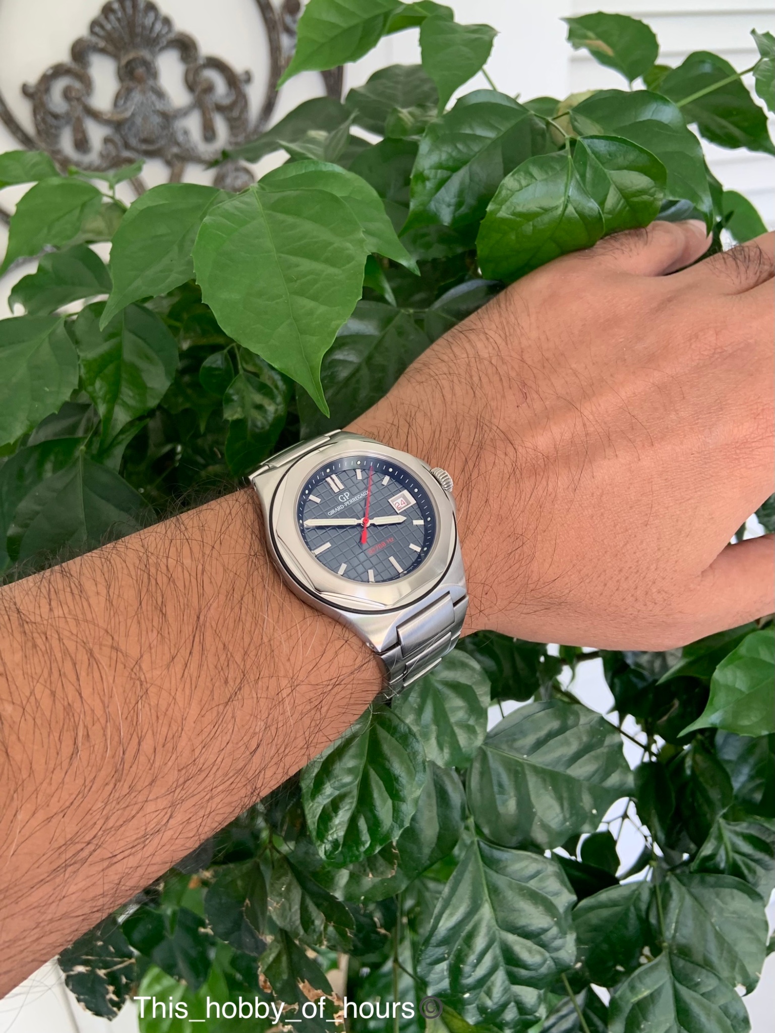 40 pieces were supposed to be made to match GP’s 40 th anniversary in quartz technology. Display caseback with decorated calibre 13500 unique.