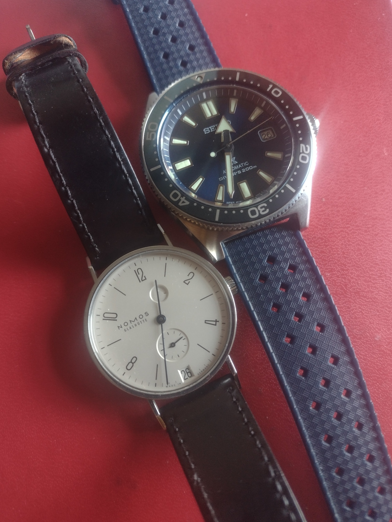 Hi All A nice contrast - my Nomos Tangente Seiko Diver