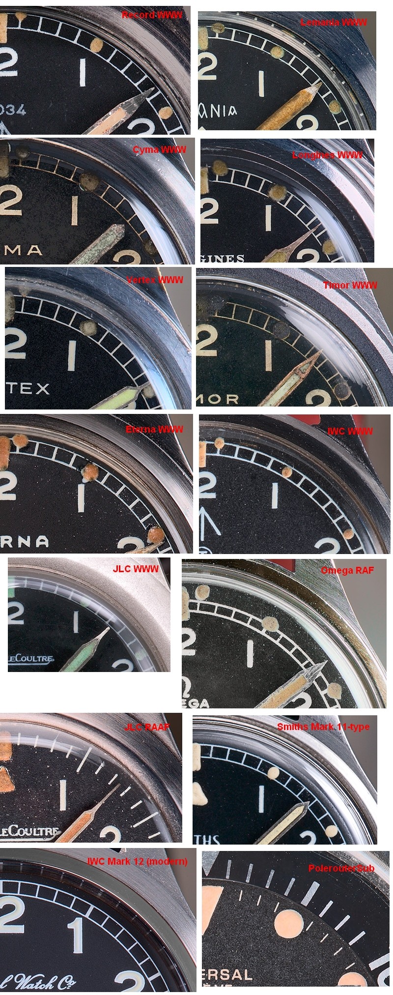 Below are examples of several WWW dials, some more worn, some less, one a NATO replacement, at least one a restoration. Then there are the pilots', including a modern Mark 12 for comparison, and lastly the lovely PolerouterSub: