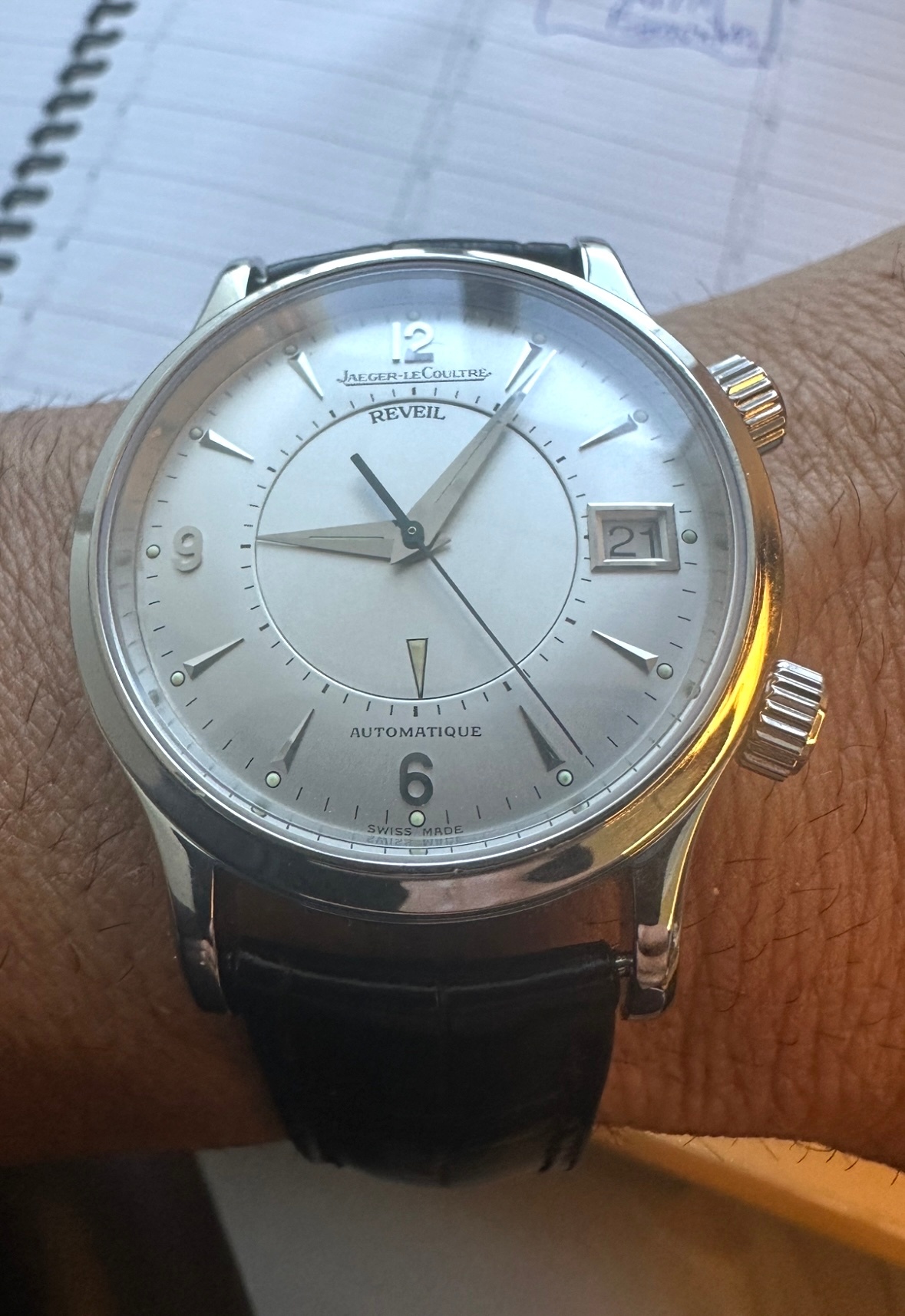 Came across this Memovox in the window of a vintage shop. It had box and papers and was originally sold about 25 years ago at Les Ambassadeurs on the Banhoffstrasse a few blocks away. Always was interested in getting one of these but was waiting for the right one. I like the “Reveil” print one the dial which gives it a vintage feel. It’s just back from service at JLC and they kindly follow instructions to leave it in its original state.