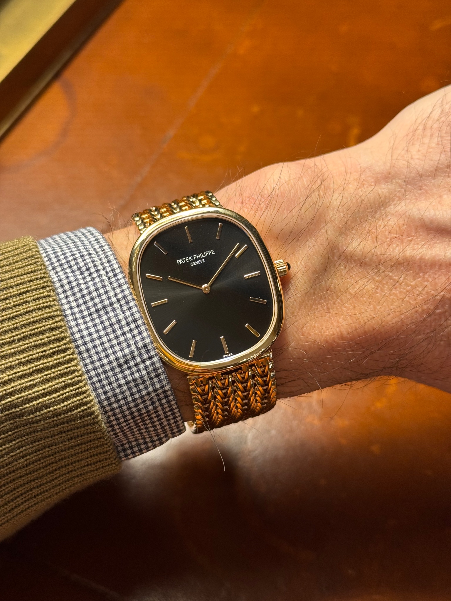 This yellow gold Patek Philippe ref. 3821/1 features a bracelet crafted by Jean-Pierre Ecoffey . The links are sculpted into repeating “ bamboo ” bars. The case measures 32 mm and the watch is powered by calibre 177 . My feelings are mixed : some part of ...
