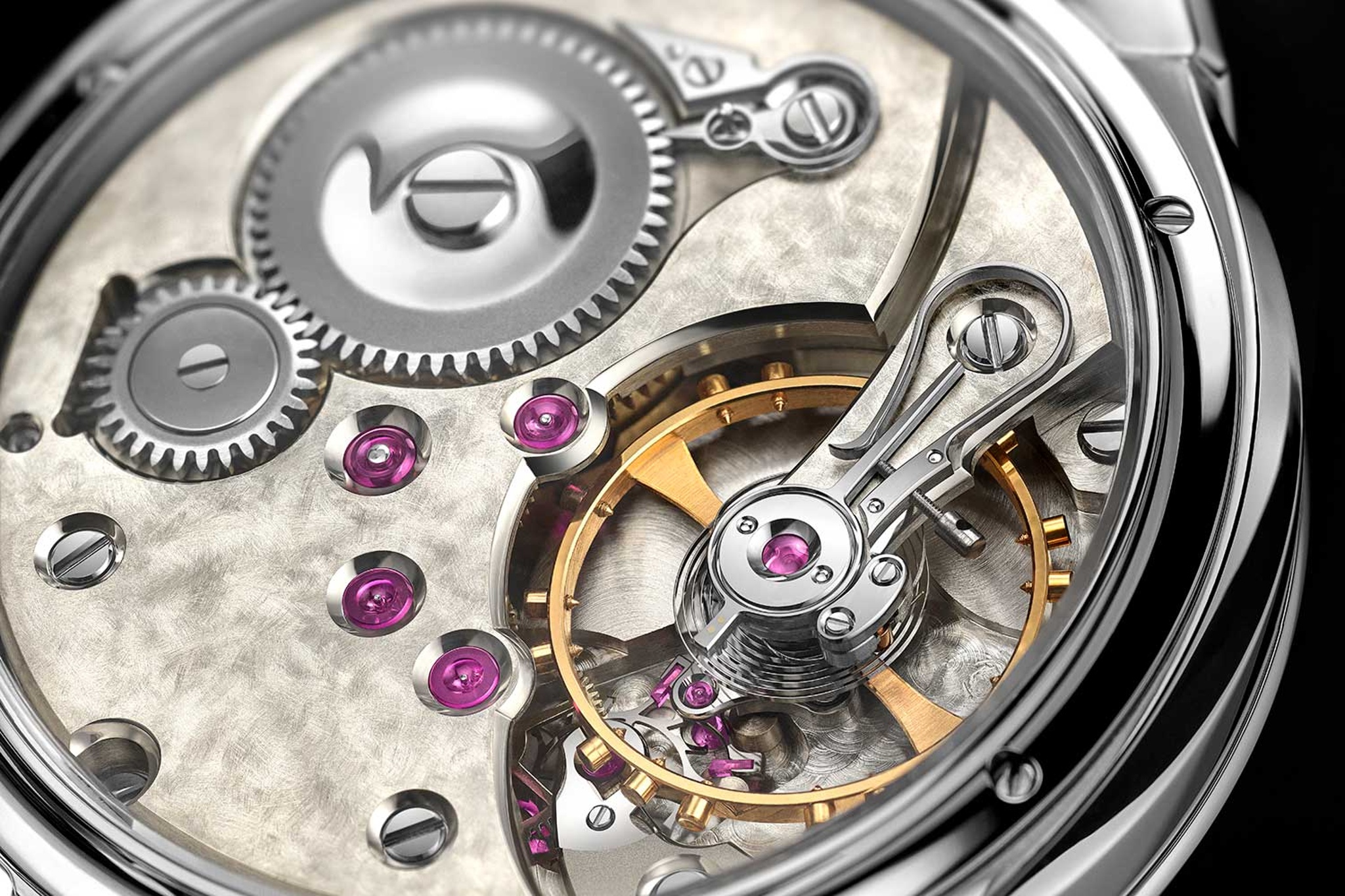 "Charbonnage" is a traditional Parisian watchmaking finishing technique that involves using a block of charcoal and oil (or sometimes 9-micron sandpaper for a similar effect) to gently scrape the surface of (typically in German Silver, sometimes brass also) the main plate or bridges.