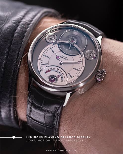 "Flamingo is the first wristwatch with a luminous balance mounted on the dial side. The unique geometry of the balance, featuring its luminescent inserts, creates the illusion of a floating ring of light when oscillating in the dark. The polished bevels on the balance enhance this effect, and even the slightest tilt of the watch produces reflections reminiscent of light playing on the surface of water."