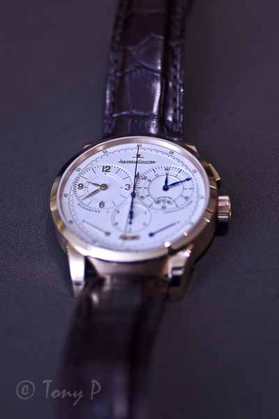 The time-keeping and chronographic functions are nicely demarcated via use of two colours for the hands: gold and blued steel. The "leaf" hands themselves are a departure for JLC, and give the watch a somewhat Patek-like feel - which I like!