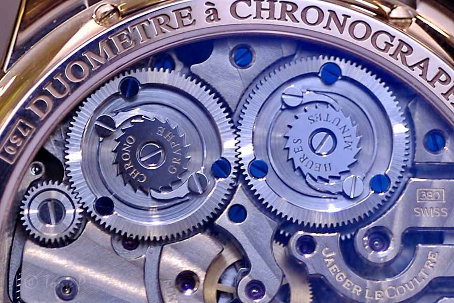 Note also in the above shot, the visible heart cam and reset hammer for the chrono seconds wheel. These details are usually hidden, at least on all the chrono movements I've seen. Is there something specific about the independent-power-train concept that allows this stuff to be laid bare? If so, JLC are to be congratulated for capitalising on the opportunity.