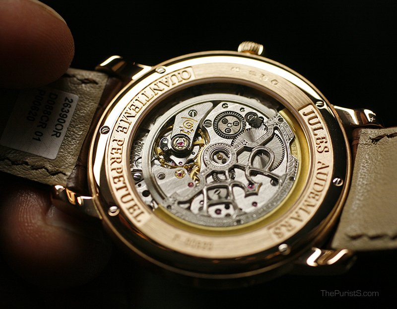 The perpetual calendar mechanism is thus allied with an excellent base movement. The skill and mastery acquired by Audemars Piguet's watchmakers in the field of ultra-thin movements have enabled them to house the 355 parts of the Jules Audemars Perpetual Calendar within a tiny space just 4 mm thick.