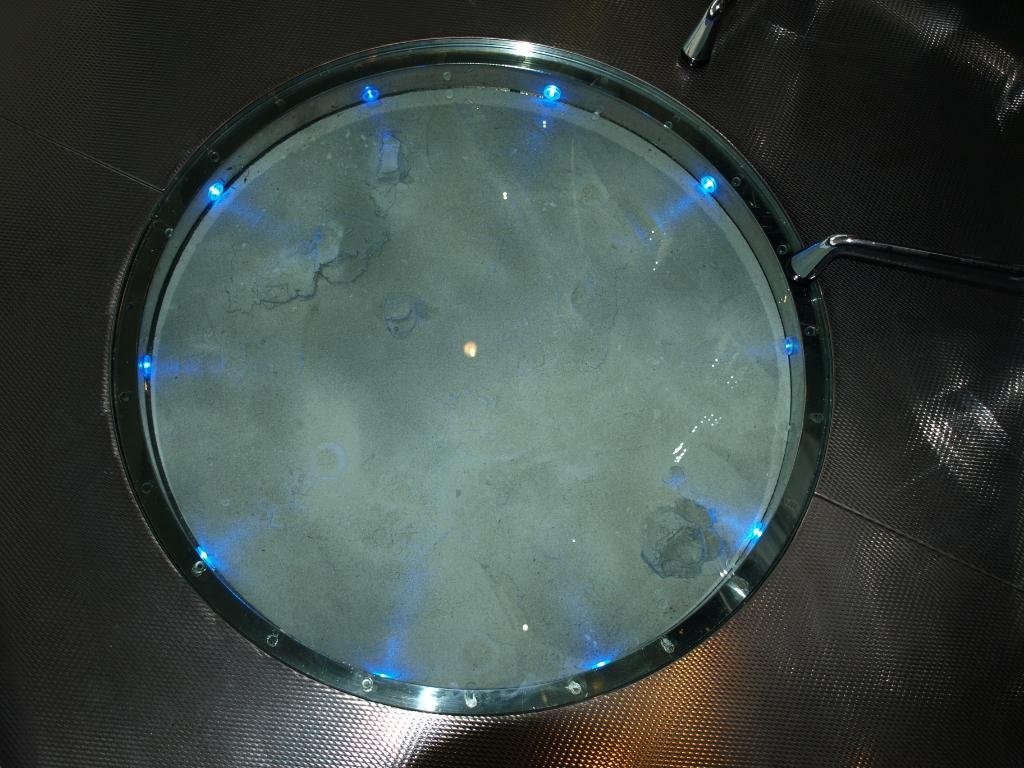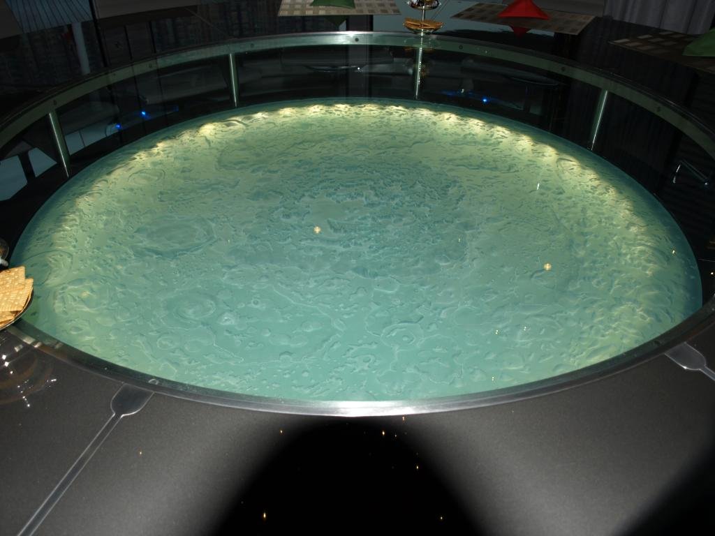 The central portion of the table is a hand made crystal bas-relief representation of the moon's actual surface.Lit by optic fibres,it gives off a lunar glow.
