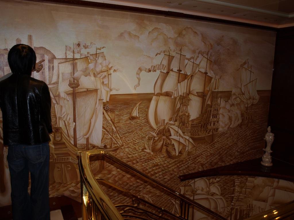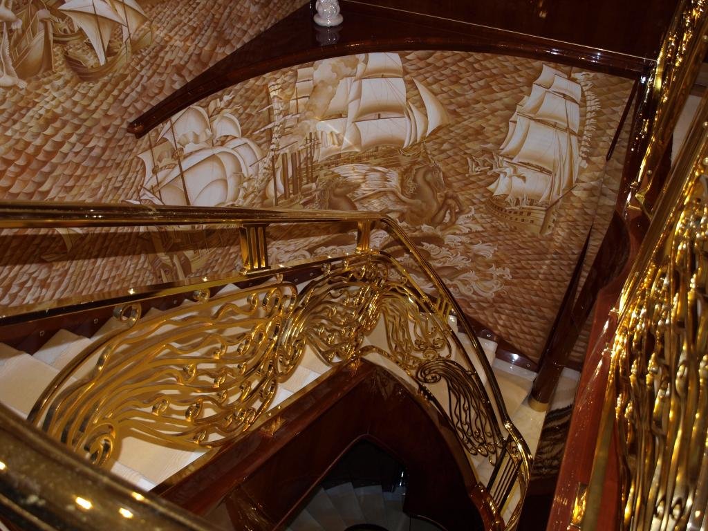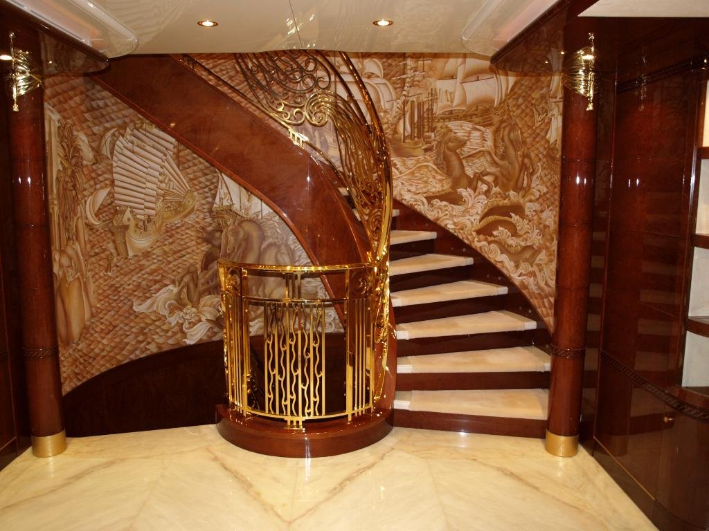 Details of the Trompel'oeil mural and banister by Astolfo Turelli that was inspired by panels recovered from the 1930s passenger liner S.S. Normandie.