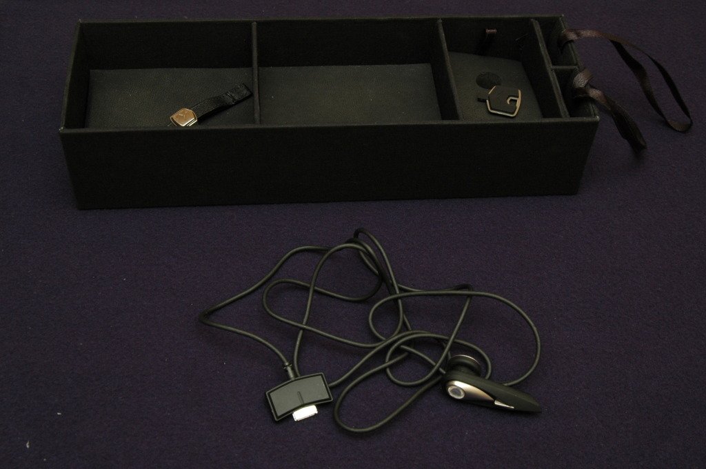 Sliding Tray with earphone and battery compartment release key.