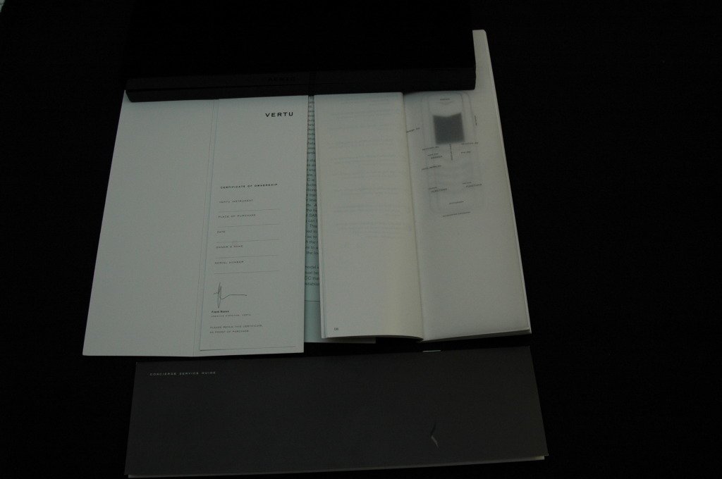 The model in this review is the Signature M, with the new hardware upgrade as of 2006. The Signature M supposedly embodies the essence of Vertu's top quality promise. Alongside the new Signature S, it is still the current model and is sold in boutiques at the retail price of US $11,000. The packaging is large and heavy. It measures 11.5 inches by 7.5 inches, and is lined with fabric. The weight reminds me of those large wooden watch boxes with all the hardcover booklets and accessories inside.