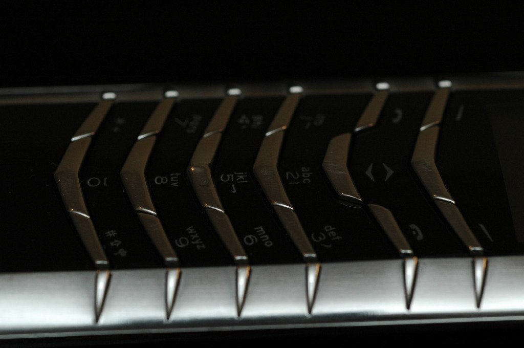 Overall, the design of the front is very strong and angular. The entire front side, from the top of the LCD screen to the bottom of the keypads, are made from 69 carats of scratch resistant sapphire crystal.The stainless keys are polished, forming a nice contrast with the brushed finish of the rims. Unfortunately, the polished keys are easily scratched if one does not have the habit of keeping the phone in a protective pouch after each use, as one can see from this example.