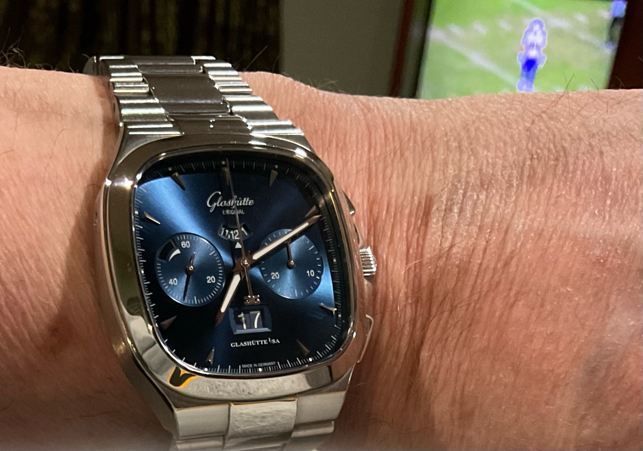 I actually purchased this last year, but it arrived in need of serious service. It's spent the last several months in the GO shop, and when it came back yesterday, I switched out the suede strap for the steel bracelet. The bracelet for the GO Seventies is particularly nice, with easy attachment and link removal/addition, plus fine adjustment on the deployant clasp. While not advertised as such, the Seventies Chronograph, with 10 bar water resistance, makes a nice integrated bracelet steel sports watch alternative to the usual suspects, while offering a lot of watch for the money. I'm glad to have it in hand!